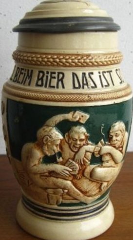 A great pastime is expressed in the verse on this light relief, glazed and etched stein marked only "Germany", ca. 1900. | |