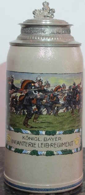 This is a 1 liter, salt-glazed, stoneware stein made by Marzi & Remy and decorated by Johann Hiedl & Son in Munich (see Chris Wheeler's "Stein Marks"), ca. 1900. The text on this stein was the name of the household-bodyguard regiment of the Bavarian kings from the end of the Napoleonic Wars until the fall of the monarchy and the subsequent disbanding of the Bavarian army. The stein was probably made and decorated for an un-named soldier in this unit at the end of his service time. | |