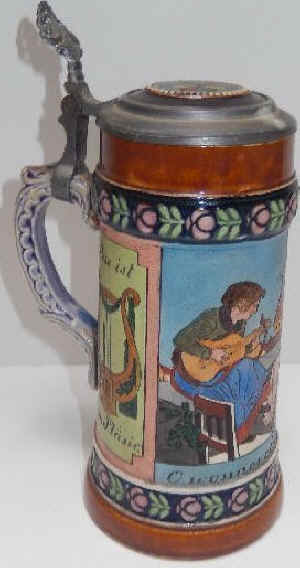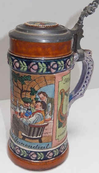 This etched stein with an outdoor bar scene was made by J. W. Remy and marked 1193, ca. 1900. The word "wunnevolle" is misspelled on the stein, corrected in the transcribed verse. | |