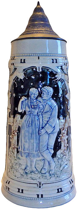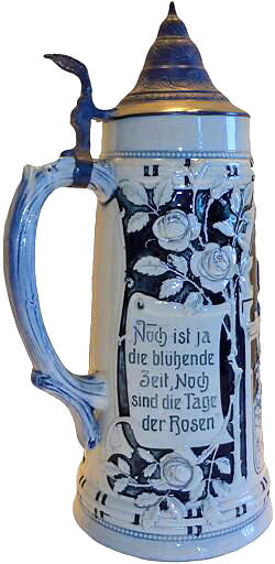 This blue/gray, salt-glazed stein was produced by Matthias Girmscheid #2034 as designed by "AS" (an unknown artist) to welcome the Spring again with a stein of beer after the long Winter. The first 2 sentences of verse can be found in translations Illustrated on a different stein under: Noch sind die Tage der Rosen. | |