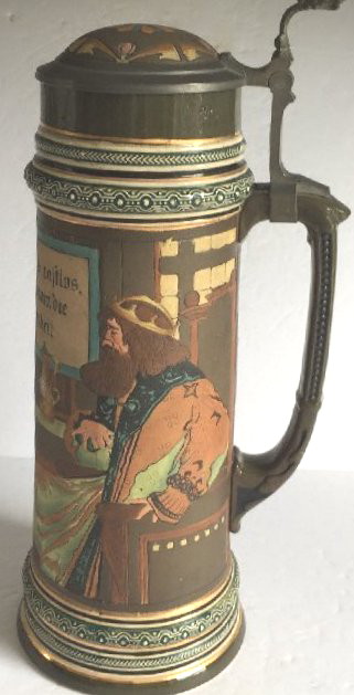 This 2 L., etched stein by S.P. Gerz marked "1384", ca. 1900 appears to have socialist leanings of the period. In 1848 there was a socialist revolution in central Europe which was squelched by the aristocracy, but continued thru WWI. Many Germans came to the US at that time settling mainly in the Mid West, Texas and Milwaukee and were known as the 48ers. My own German ancestors came around Cape Horn by ship into San Francisco in the 1850's and were known as the 49ers on account of the discovery of gold in California, but might also have been influenced by the same revolution. | |