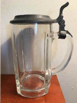 This pressed glass stein was made for the Schwarzer Bock brewery of Ansbach Germany. The title is a little redundant because Bock Bier is a dark beer. See translation "Bock mit Rettig". The stein is marked with a crown for the Sächsische Glasfabrik, ca. 1900. See Chris Wheeler's Stein Marks for more on Sächsische Glasfabrik. | |
