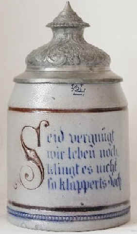 This salt-glazed beer stein is unmarked, but probably by Merkelbach and Wick, ca. late 1800's. The quaint verse relates to being merry while we're still alive and the little bell might not ring like it used to, but still works. | |