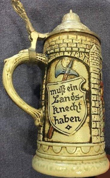 This is a cute little post WWII relief stein marked "Gerz - W. Germany". The scene shows several German Landsknechts, one who is kissing a maiden at an open window. The Landsknechts, were colourful mercenary soldiers who became an important military force in Europe in the 15th and 16th centuries. | |
