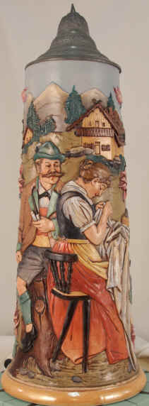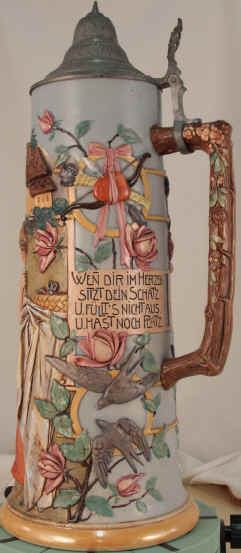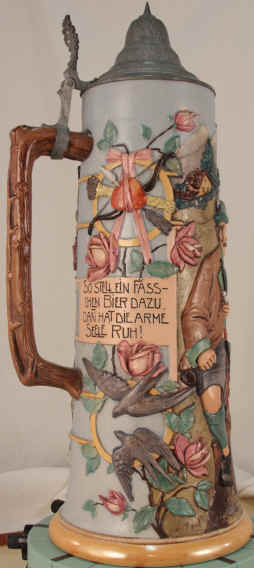 Those wily Germans always have a way to manage getting a beer. This very romantic, etched and relief, 3 L stein was made by JW Remy and is number 873, ca. 1900. | |