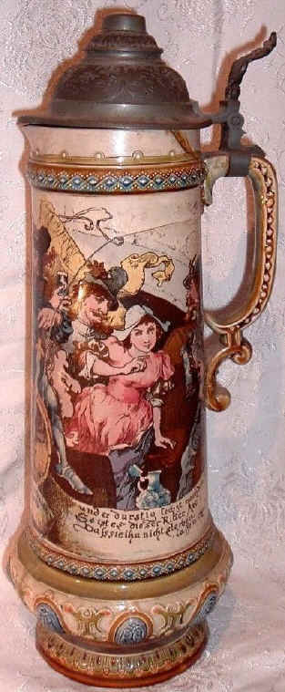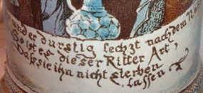This large PUG (printed under glaze) Mettlach stein #2176 dated (18)96, shows Knights at their usual barroom activities. The verse is from the third verse of an old German drinking song written by Friedrich Adolf Krummacher before 1849. The last part of the verse is not on the stein but shown below. See translation Es sei dies volle Glas geweiht for the last lines of another verse from the song. | |