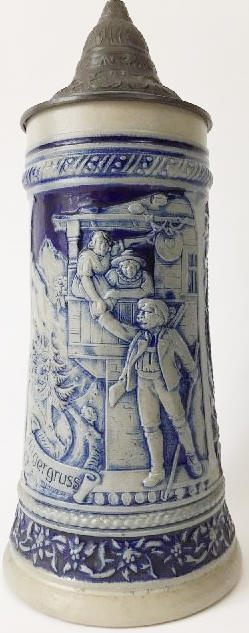This light relief, salt-glazed, stoneware stein is marked "4062 Made in Germany and RM in a circle" made by Reinhold Merkelbach shortly after WWII (see: Chris Wheeler's Stein Marks). The verse is in Bayrisch (Bavarian dialect) and shows a hunter greeting a young lady on his merry way to a hunt. | |