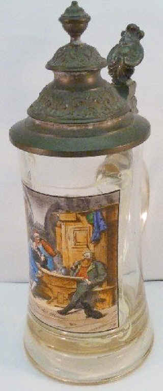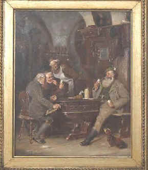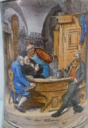 This is a nice blown glass stein with a copy of an oil painting by Eduard Grützner, ca. last quarter of the 19th Century. The framed (probably copper press) version below was probably done about 1900 and the original probably in the last quarter of the 19th Century, but before the stein was made. The scene shows a monk with a card hand that he's having a tough time deciding how to make the next play. | |