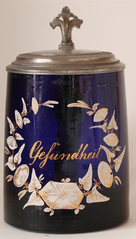 | This Cobalt-Blue, glass stein is from the mid 1800's and bears a salutation or toast meaning "To your health or well being". You've probably also heard the exclamation "Gesundheit!" (To your health!) after one sneezes follwed by the response "Danke schön!" (Thank you very much!). In olden times it was thought that sneezing was good for one's health and was also prompted preferably by sniffing snuff. | |