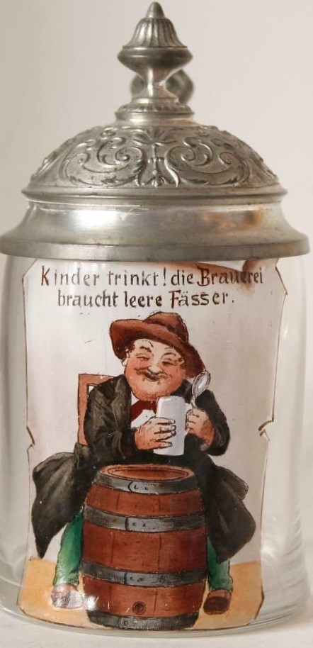 | This is a cute glass stein ca. 1900 with a transfer and painted scene. The subject matter of this stein seems to be that of a seasoned drinker assuming the role of father figure and schooling his protege on reasons to drink. | ||