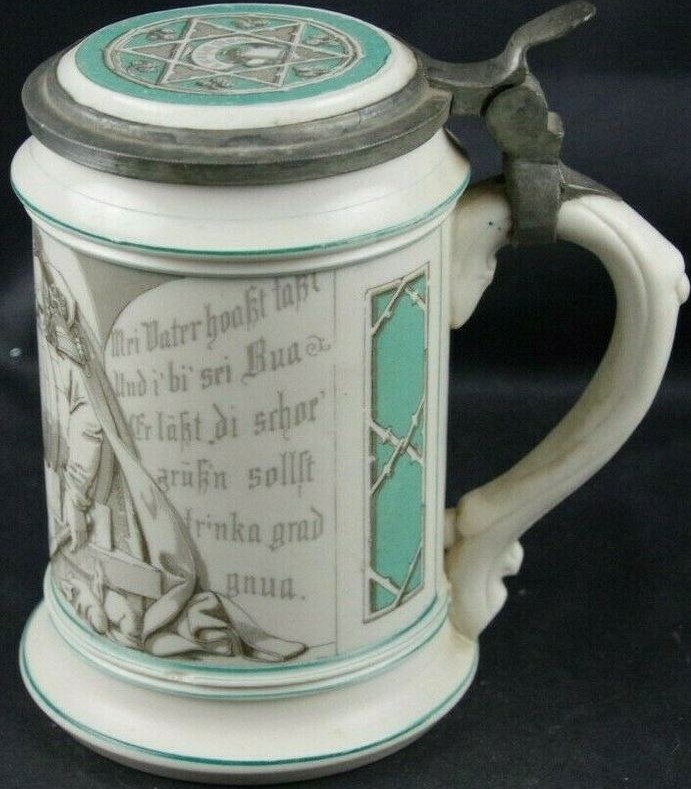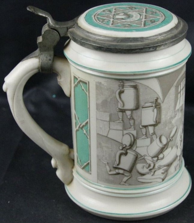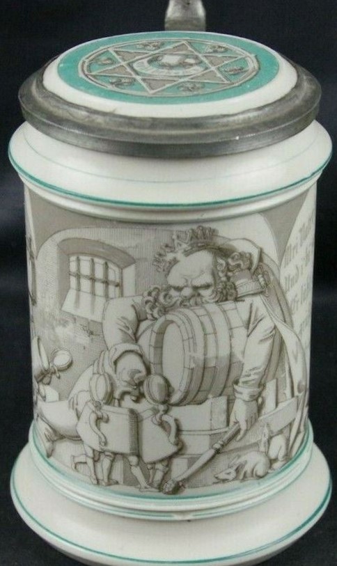 | This relatively rare Parian stein is thought to be made by Villeroy & Boch at Mettlach, ca. 1862, and has been seen with the number 728. The scene is a copy of one of the Ludwig Foltz II's VBM #328 steins. The verse is in Bayerisch (Bavarian) dialect and is self explanatory. The scene shows Gambrinus laying over a barrel filling up Ludwig Foltz's designed "walking steins" which are perhaps implied to be the offspring of the barrel. See: Prosit 6/2010 pp. 6-11. | |