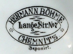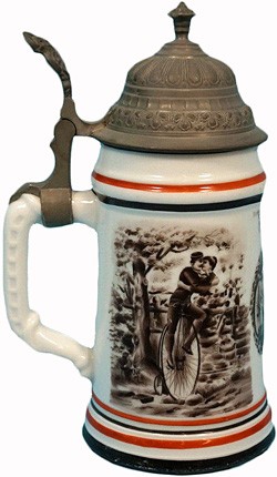 This porcelain stein with lithophane was made for members for a Cycling Club in Germany ca. 1890's (handle and body like 1899 regimental) and decorated by Hermann Böhme of Chemnitz, Saxony. The inscriptions on the center shield are: "Deutscher Radfahrer Bund" (German Cyclist's Club) and "All Heil" (Hail (or health) to all). The side scenes show a Penny Farthing or High Wheeler Bike and the phrase "Rad Heil" (ride healthy or hail bicycle riding). The text indicates that cycling was a healthy and sportsmanlike endeavor. | |