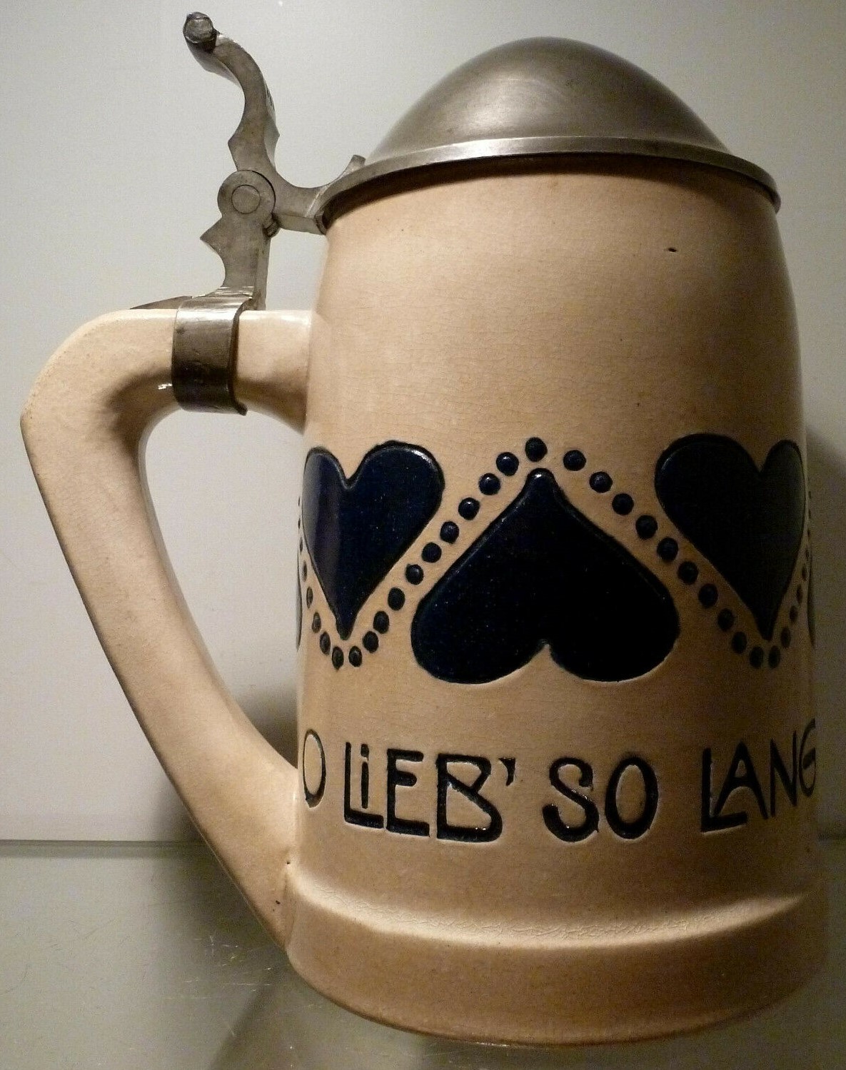 This stein would make a good Valentine's Day present and the verse is certainly good advice. The stein is marked Dümler & Breiden 891, ca. early 1900's Jugendstil (youth style, modern art) period. This verse was the beginning of a long and apparently popular poem by Ferdinand Freiligrath, a 19th-century German writer. In 1847, Hungarian composer Franz Liszt set the poem to music, and eventually adapted it into his famous Liebesträume (Dreams of Love) No. 3. | |