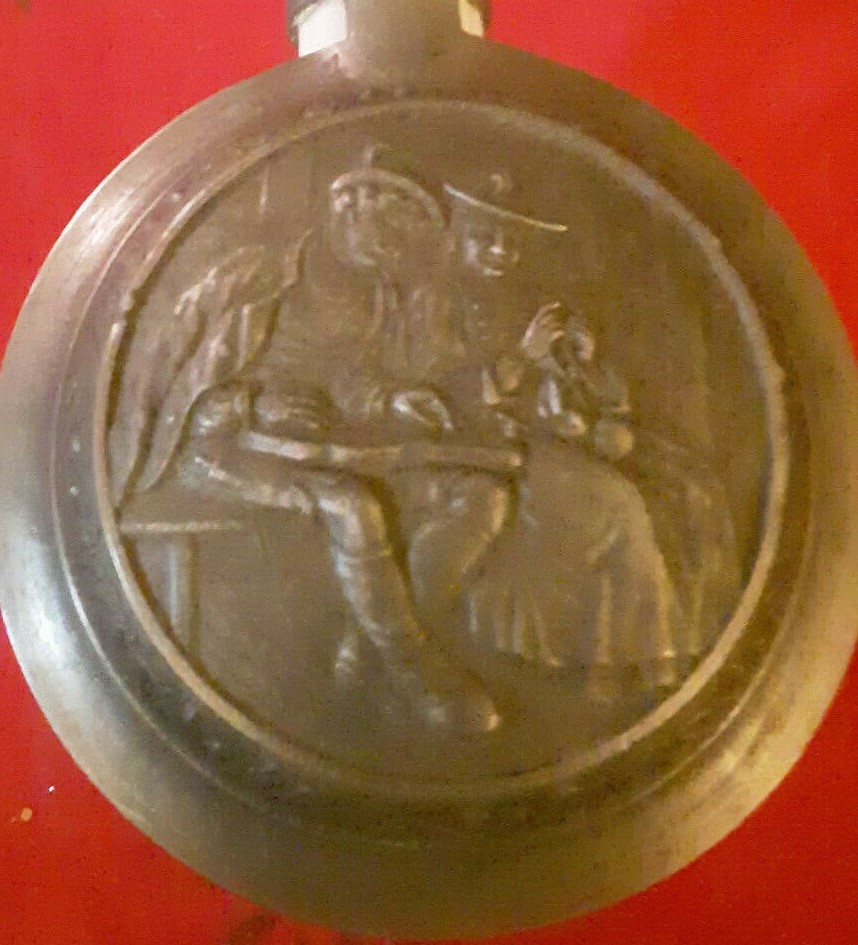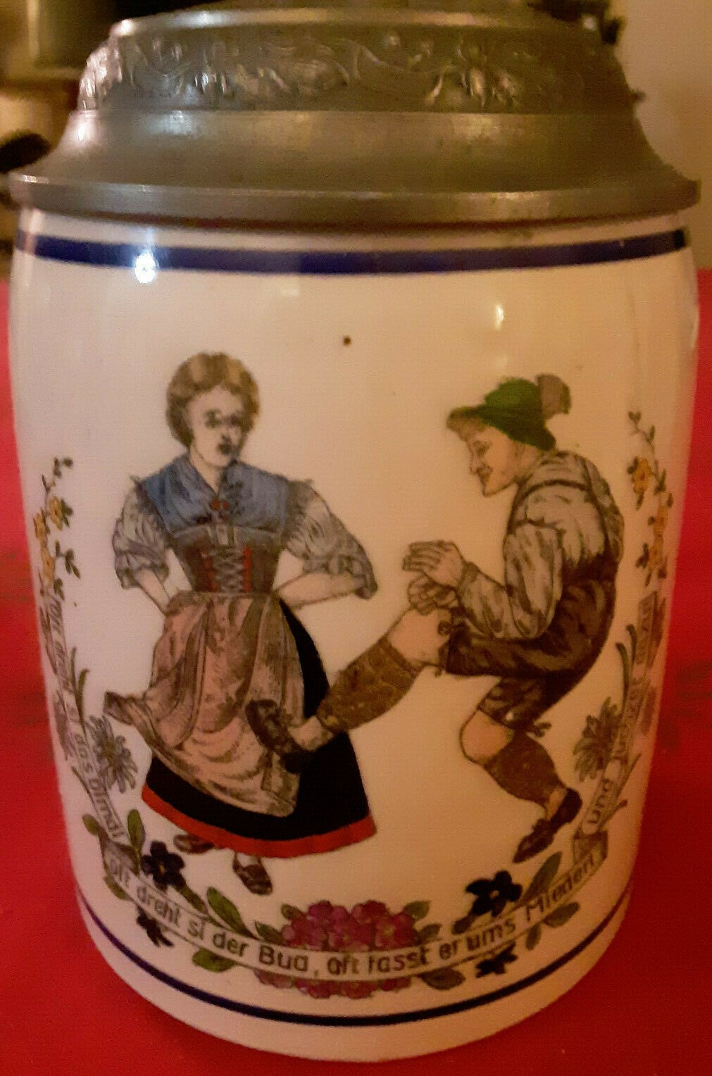 A nice Joseph Rieber & Co., print under glaze German stein with an ornate pewter engraved lid. The scene in front features a Bavarian couple dancing with the text in Bayern (Bavarian dialect), ca. first half of 1900's. | |