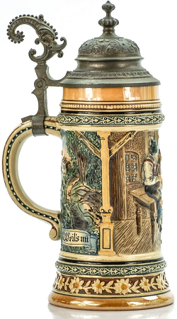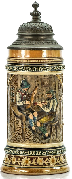 This nice relief stein shows a Guitar player and a Zither player in a Tyrolean Alpine inn. The scene is “Tyrolian” because of the red wine on the table. It would it be Bavarian if they were drinking beer. Made by Merkelbach & Wick with mold number 1128B, ca. 1900. | |