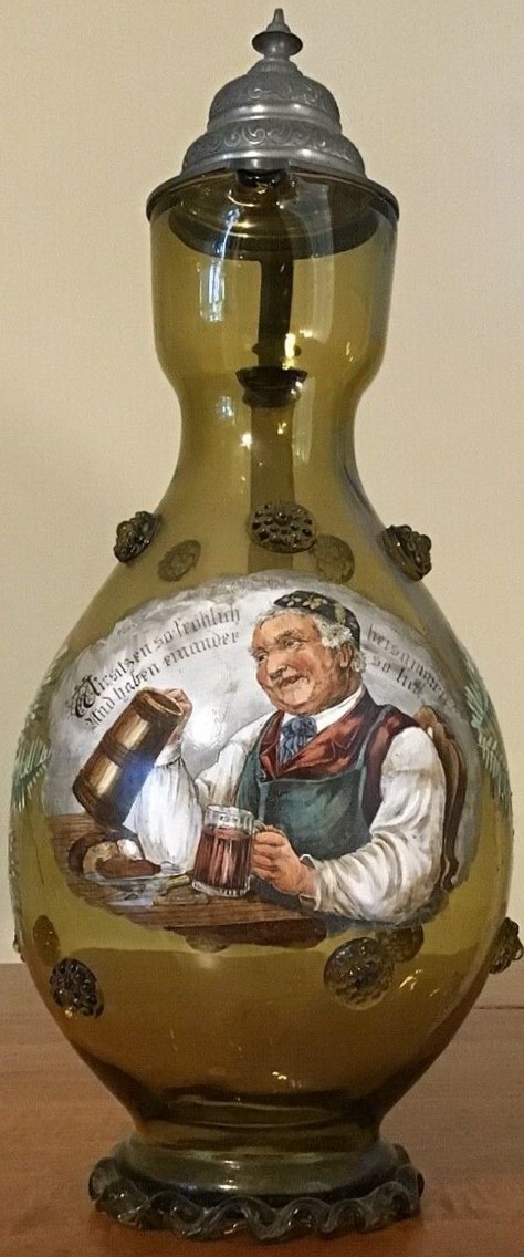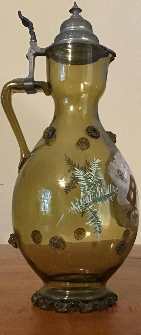 This nice hand-painted, green-glass pouring stein reflects the real meaning of "Gemütlichkeit" (wholesomeness). The style, pewter lid and applied prunts date the stein to ca. late 1800's. | |