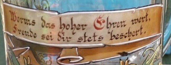 Worms is a city in Rhineland-Palatinate, Germany, situated on the Upper Rhine about 40 miles south-southwest of Frankfurt-am-Main and just northwest of Mannheim on the West Bank of the Rhine. This hand painted glass stein displays the Arms of the City of Worms and a dedicated verse, ca. 1900. | |