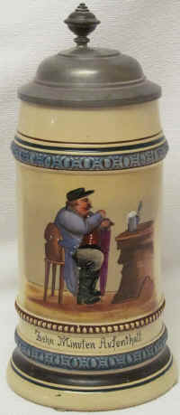 | This seems to be like the ten minute coffee break, but even better on this stein marked with the Merkelbach & Wick logo and inked "289", ca. 1900. | |