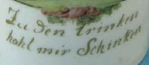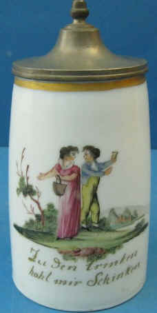 This guy either has things under control or he's going to get his butt kicked and the scene looks more like the latter on this Milchglas (milk glass) stein, ca. 1800. | |
