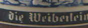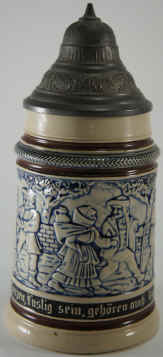 | This verse is like a toast to all the good things on a young man's mind. The stein is a relief, stoneware type marked "Germany 956" ca. 1900. | |