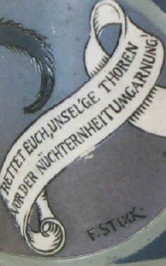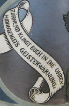 | This is one of a small series of etched, Mettlach steins with verses extracted from Viktor von Scheffel's "Trompeter von Säckingen" (Trumpeter from Säckingen). This stein was designed by F. Stuck and is marked with the Mettlach logo and mold number 2007 and dated 1902. The front has the likeness of the cat "Hiddigeigei" and the lid shows "der Freiherr" (the Baron). | |