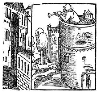 The Count ran in haste from the table where the feast yet stood, donned his armor and rode out with his troops to hunt through the fields. Meanwhile, Eulenspiegel came down from the tower, went to the Count's table and took the roasts and food. He filled himself and went back up in the tower. As the knights and foot soldiers found no enemies, they spoke to one another: "This is a trick the watchman has done from roguishness," and they returned to the town. The Count called out to Eulenspiegel, "Have you gone crazy? Why have you trumpeted 'Enemy!' when there is none? When enemies are there, you don't blow, and then you raise the alarm when there are none! You are as good as a traitor!", whereupon he set him out and engaged another trumpeter in his place. But Eulenspiegel was made to serve as a footman. That vexed him greatly. He was eager to get away but had no way to be free from the job. When they attacked against the enemy, he was always the last one to leave the city gates and when they were traveling home, he was always first through the gates to be home again. The Count asked him how it was that in marching out, he was always last, while homeward he led the way? Eulenspiegel said, "Thus it was when you and all your servants ate while I sat and languished in the tower until I was faint with weakness. Now in order to become strong again, I am first and last at the table. When I become strong, I will be first and last to the enemy." The Count spoke, "You shall no longer serve me!", and gave him his dismissal - thus making Eulenspiegel happy, as he had no eagerness to combat the enemy. |