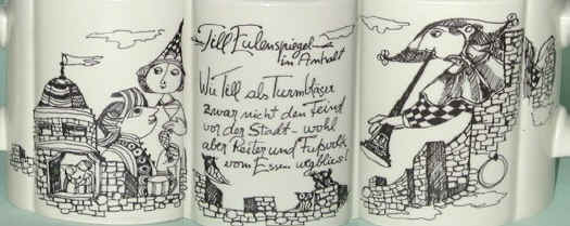 Once Eulenspiegel was forgotten on the tower and no food was sent to him. On that same day, the enemies of the Count attacked the town to take away the cows. They drove the cattle away while Eulenspiegel watched them through the tower window, but he gave no alarm nor outcry with the horn. When the Count heard the surprise attack, he hastened to the tower and saw Eulenspiegel up there lying in the window, laughing. The Count called to him, "Be quiet! Why are you lying in the window silently?" Eulenspiegel called back, "I was not called for the meal and so I won't perform happily." The Count called, "Would you not sound the trumpet for the enemy?" Eulenspiegel called back, "I saw no need to blow the trumpet. The fields are still full. It is enough for them to take the cows. If I raised the alarm, more enemies would come and they would strike you to death."