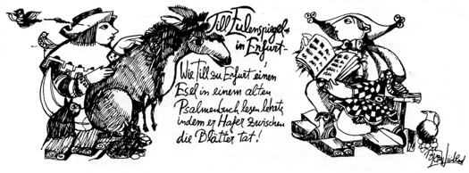 Eulenspiegel came to Erfurt where there is a large and famous University. The professors of the University had heard much about his sly cunning and sniffed to themselves that he would not play tricks as he did in Prague (referring to another tale involving University students), and they decided they would give Eulenspiegel a donkey to teach as there are many donkeys in Erfurt, young and old. They sent for Eulenspiegel and said to him "Master, you have advertised that you can quickly teach every creature to read and write. Now, here are the gentlemen of the university wanting to give you a young jackass to teach. Do you believe you can teach him?"