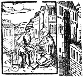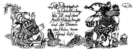 Once Eulenspiegel came to Quedlinburg on a market day. He was in need of provisions, for just as quickly as he acquired things, so they were gone. As he went along the way he thought about how he might acquire the money to get provisions. Presently, he saw a country woman in the market with a basket full of fine chickens and a rooster. Asking what they were worth, she answered him that they would cost two Stephensgroschen. Till asked, "Won't you give them to me cheaper?" The woman refused, whereupon Till took up the basket