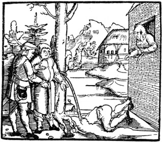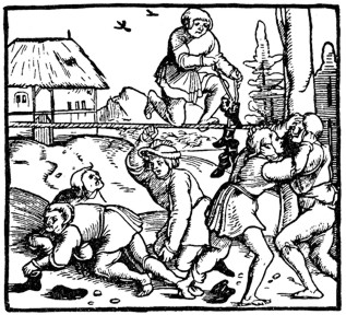 The next day Till called out at the market-place that he would show them new tricks on the rope that afternoon, special tricks never accomplished before. The towns-people were all there and Till didn't disappoint them: he did handstands and strange leaps on the rope to wild applause and acclaim, though secretly they hoped he would fall into the river again. Till called to them: "Shall I show you a trick never done before, the best trick I know?" "Yes," they called. "A trick never before performed?" "Yes," they roared, never asking why they should be privileged to see such stunts. "But you must help", called Till. "I have a long rope in my pocket. Each of you tie your left shoe to the rope and hand it up to me." Everyone complied, expecting a wonderfully funny trick. Till pulled up the rope with more than a hundred single shoes. "Attention," he yelled, "here comes the one-of-a-kind trick." He pulled out a pair of scissors from his pocket, cut each shoe off individually and threw one here, one there, one every-where, yelling "Yoohoohoo, everyone find his shoe!" And then he watched from the rope while the townspeople hopped around on one foot, each searching for his own shoe or a better one, watching them push and shove and fight and yell. While they had laughed at his misfortune, they begrudged him their own. |