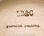 LB&C was more than likely, L. Bauernfreund & Co., pewter foundry, Munich, founded 1883. They employed 30 people and remained in business until World War I. They produced pewter fitted beer steins and services in porcelain, stoneware, faience and glass. They won exhibition awards in Nuremberg in 1885 and Amsterdam in 1887. We find some porcelain character steins made by a factory other than Freising but in the narrow bodied early Freising style that have "LBCM" stamped into their pewter, usually on the shank. Mike Wald noted that he had encountered an LB&C stein with "LBCM" stamped on the shank, making the connection between the two marks. All of the known steinzeug, or salt glaze stoneware pieces, marked LB&C were made by Hauber & Reuther. |