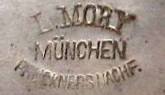 Ludwig Mory - Ludwig Mory's pewter shop is no longer located in the Marienplatz in Munich. The shop has moved to Amalienstrasse 16. His mark can be found on a few stoneware pieces that he obviously purchased to sell through his shop. |