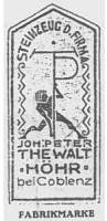 TP - The owner of this mark was Johann Peter Thewalt, NOT Paulus & Thewalt, regardless of what you may read in a couple of leading reference books. See the "fabrikmarke" or factory logo just to the left. We have an e-mail from Paulus and Thewalt that reads as follows: "Dear Mr. Gray, At first let me thank you for your request. We are sorry to tell you that we never produced Bierkruge. We produce and deal with pharmaceutical instruments. Best Regards, Torsten Bowe, Paulus & Thewalt GmbH & Co." For more on this mark see the article on the SCI web page. |