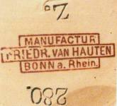 Friedrich van Hauten - Located in Bonn, at 31-32 Sternstrasse, they were decoraters of glass, porcelain and stoneware. Founded in 1890, they were in business until ca.1914. They purchased their bodies from seveal sources including V&B and Merkelbach & Wick. Like A. Wahnschaffe above, they identified themselves as a "Hoflieferant," or "Purveyer to the Royal Court." In the case of van Hauten it was the German, Imperial Court. |