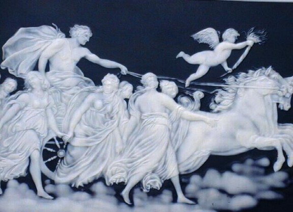 cameo - similar to relief, but the decoration is an unglazed,