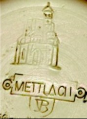 ![]() The two most commonly found trademarks are the incised abbey mark and the painted or stamped Mercury mark. The abbey mark, frequently referred to incorrectly as a "castle", is a representation of an 11th century abbey which still stands today in the village of Mettlach. This trademark, among other marks, was pressed by hand into the bottom of the piece. The mark consists of the abbey above a banner, or placard, which includes the word "METTLACH" and the joined letters V and B (for Villeroy and Boch). These two elements of a single mark were actually applied separately, and as a result, it is common to find examples where they are not aligned exactly as in our example. The incised abbey mark was normally used on relief, etched and cameo wares, and on some later print-under-glaze or PUG items.