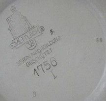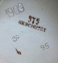 ![]() PUG items are frequently referred to by the combination of decoration and form number, as 1028(2339). This is particularly useful in the case of PUG steins, where many different designs were applied to the same body. The most common forms for PUG designs are 1526 (ranging in size from quarter-liter to three-liter), and 1909 (quarter-liter to half-liter in size). While the majority of PUG decorations appear on only one form and in only one size, some were applied to more than one form, and a few to the same form but in more than one size. |