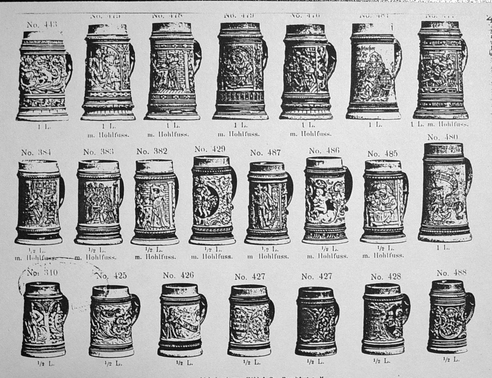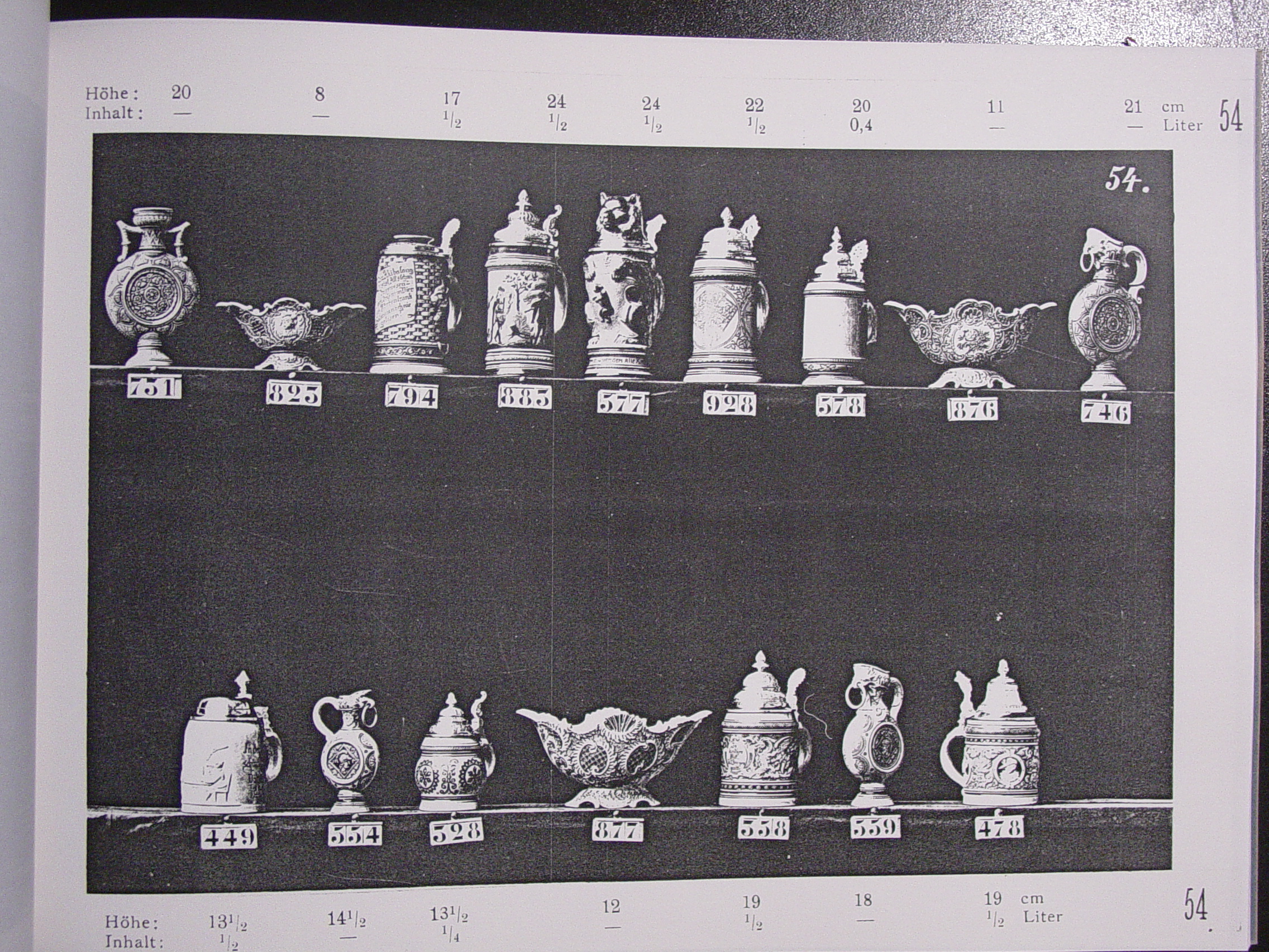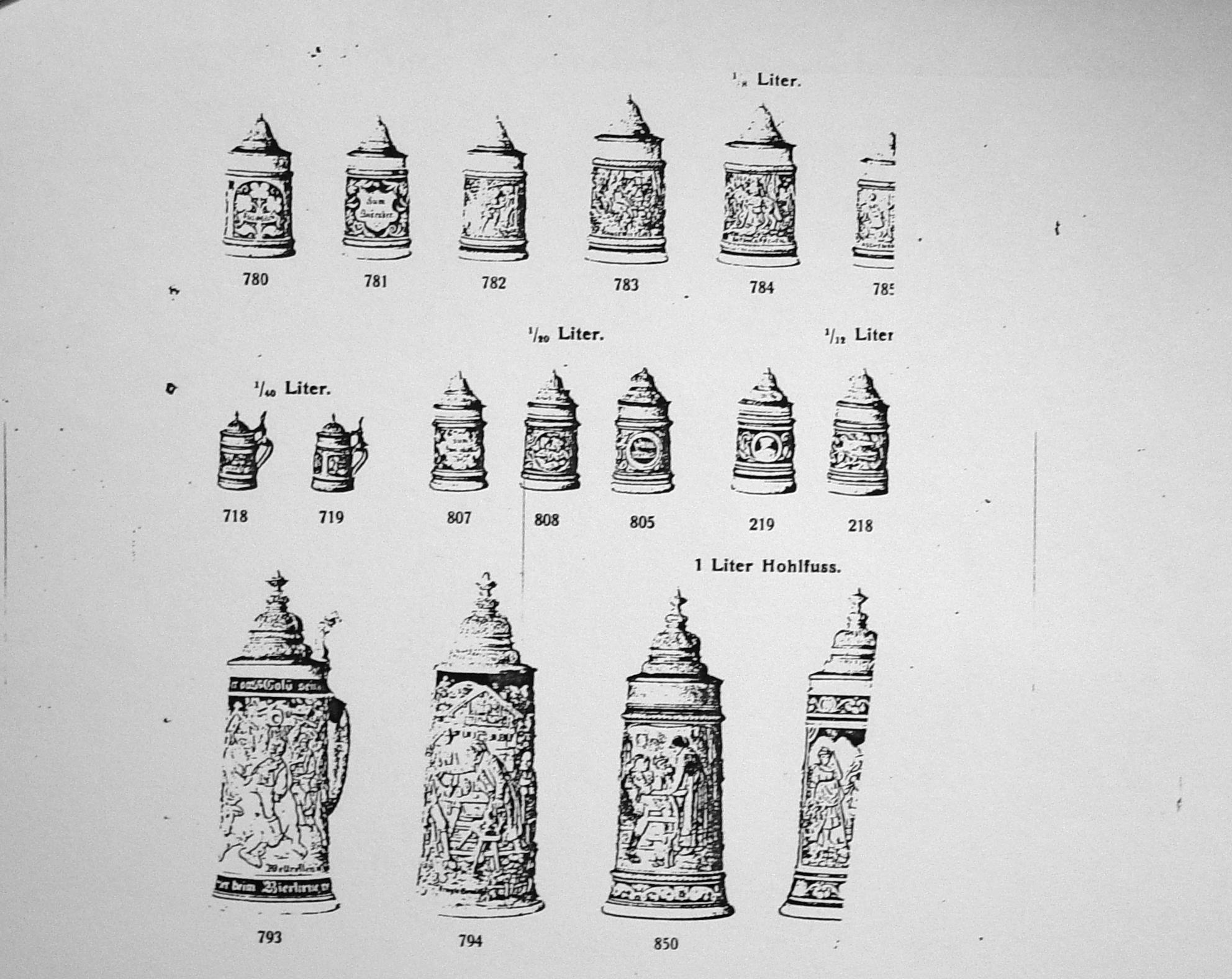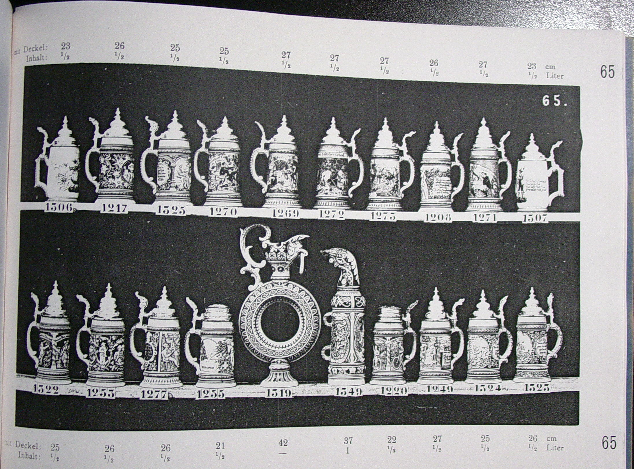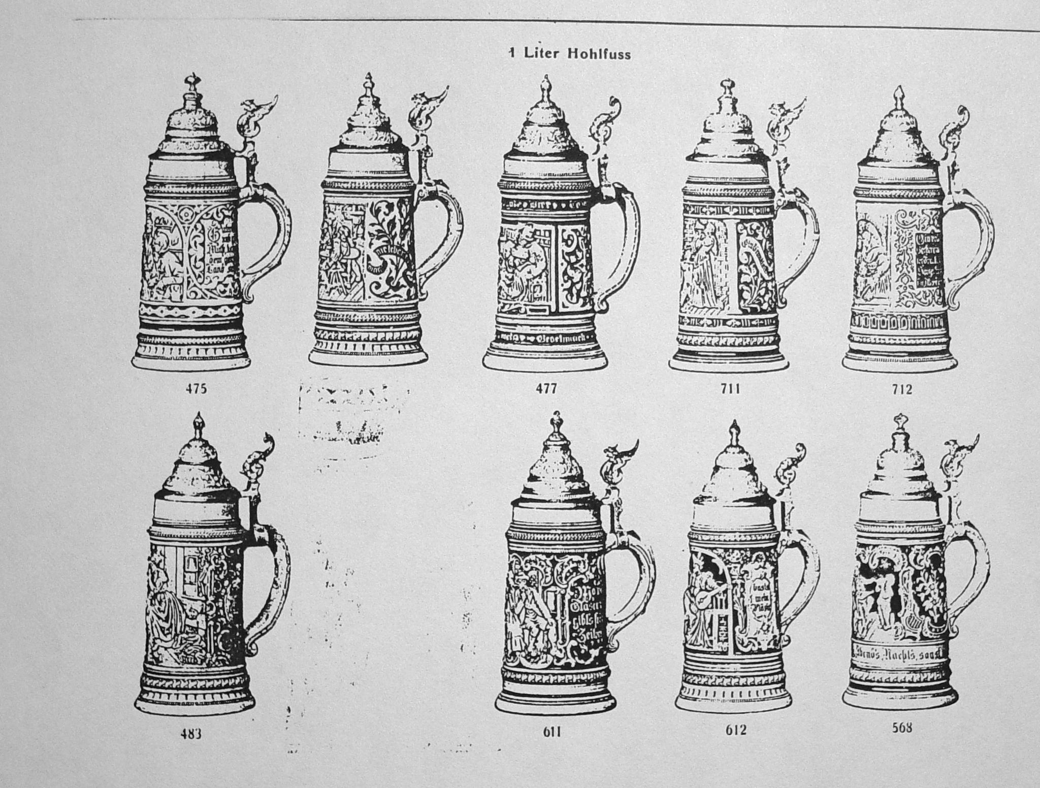 Who made this stein? Using available original manufacturers catalogs, this page allows you to look up possible answers to that question. Mold numbers beginning with 1 and ranging into the thousands appear in the first column below. For each mold number, the manufacturers who produced an item with that number are listed, along with a link to an original catalog page showing that item. Scroll down to the mold number in question, then examine the catalog pages to confirm the manufacturer of your stein.