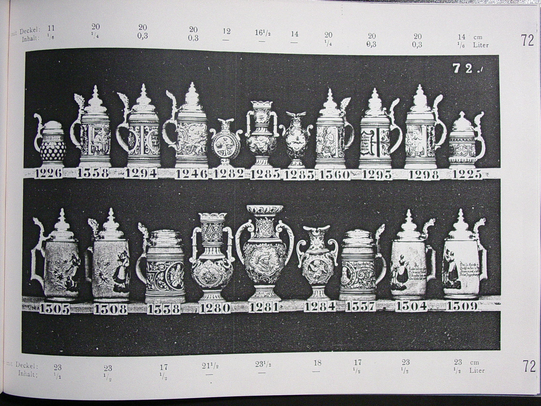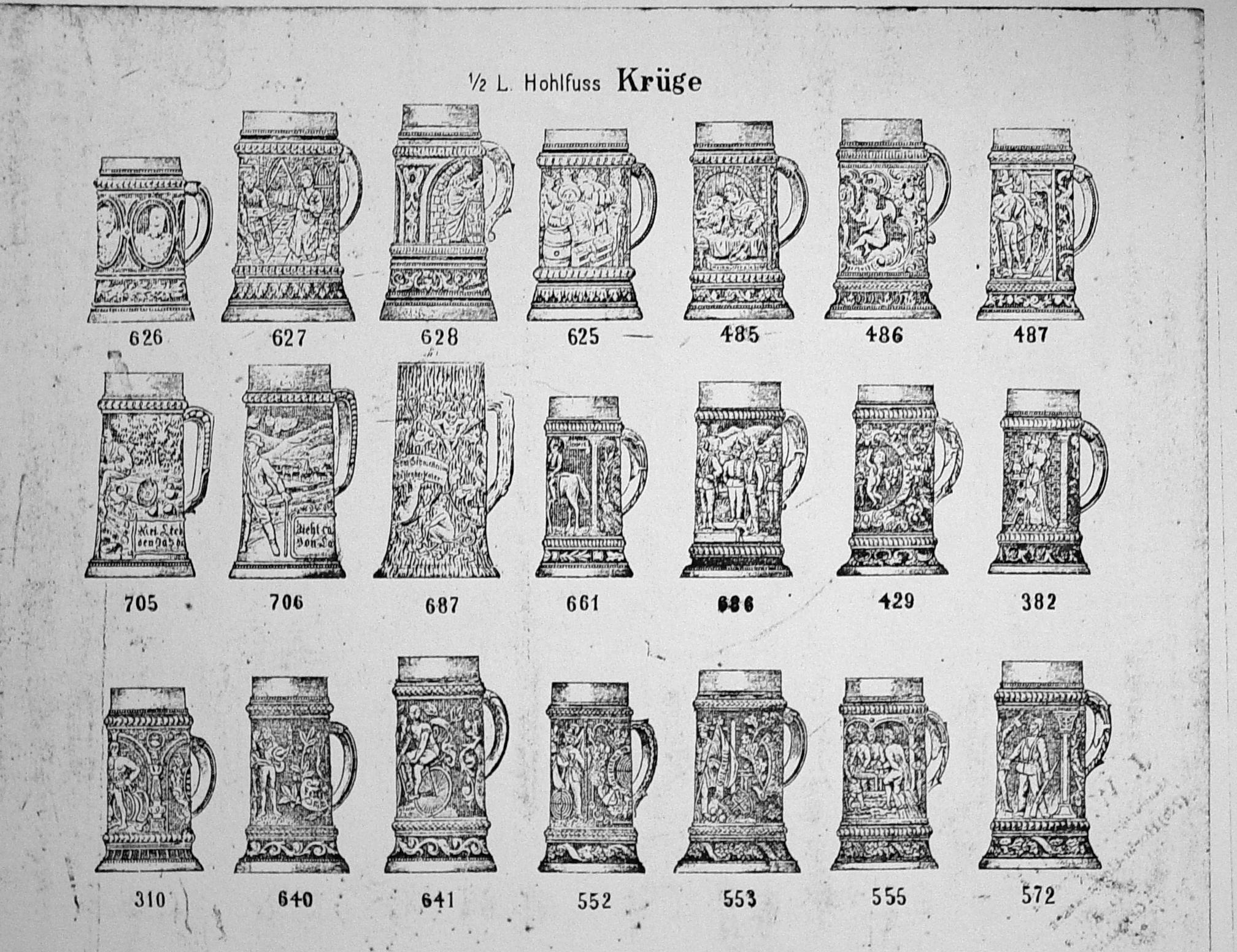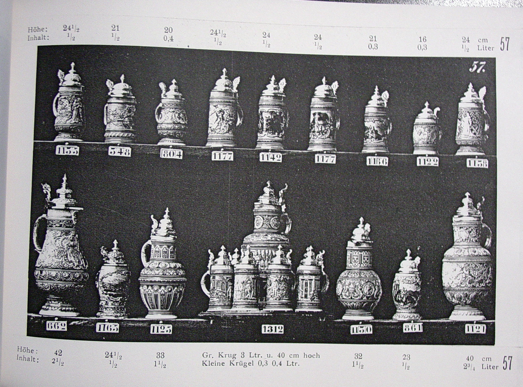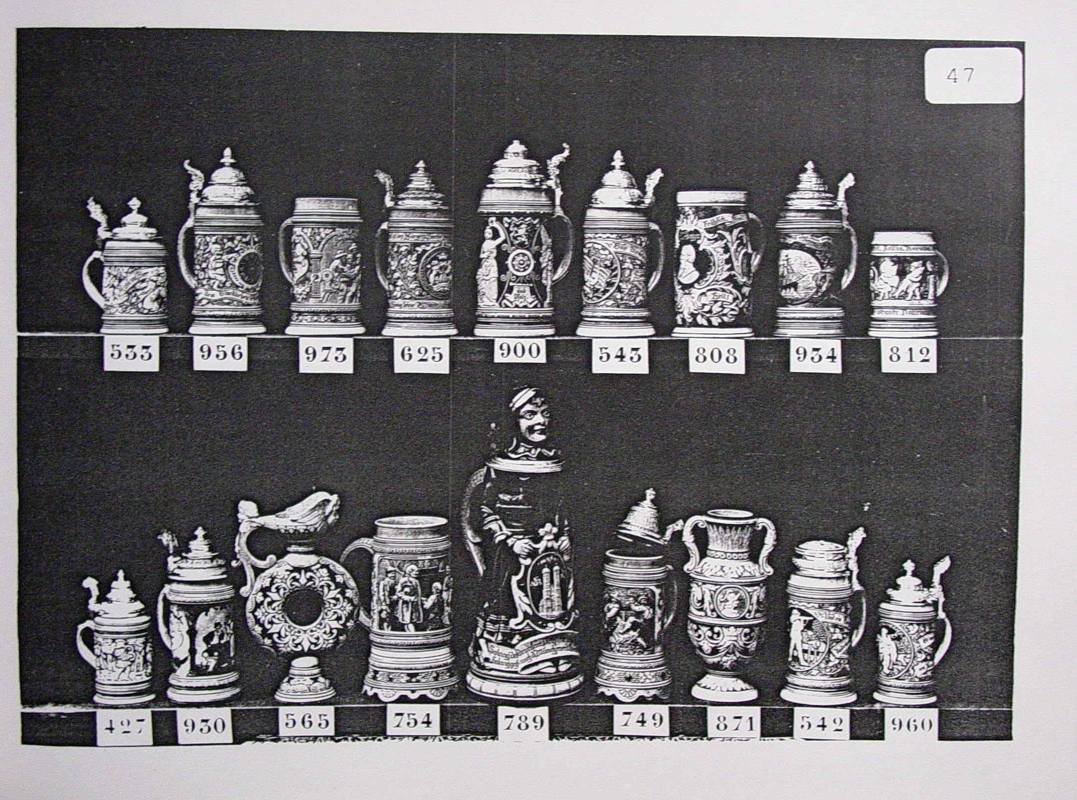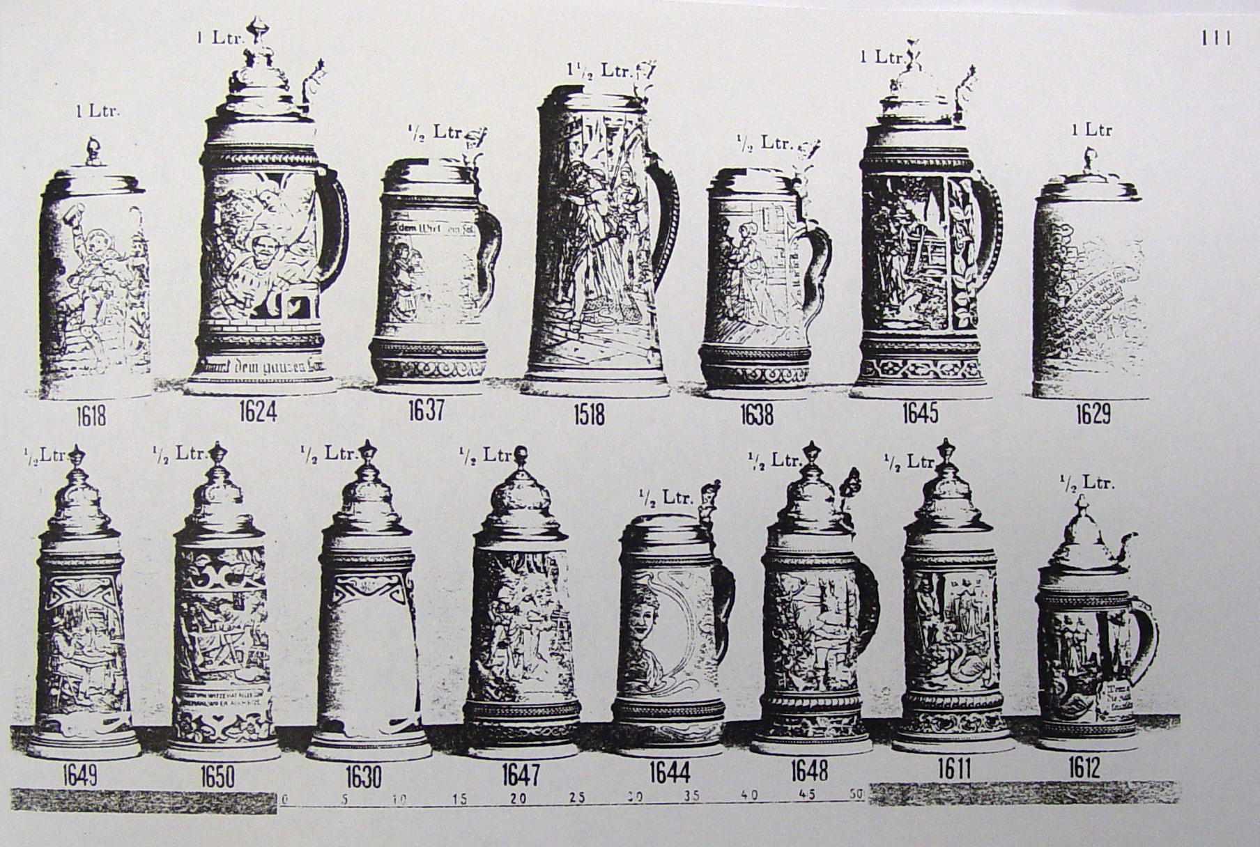 Who made this stein? Using available original manufacturers catalogs, this page allows you to look up possible answers to that question. Mold numbers beginning with 1 and ranging into the thousands appear in the first column below. For each mold number, the manufacturers who produced an item with that number are listed, along with a link to an original catalog page showing that item. Scroll down to the mold number in question, then examine the catalog pages to confirm the manufacturer of your stein.