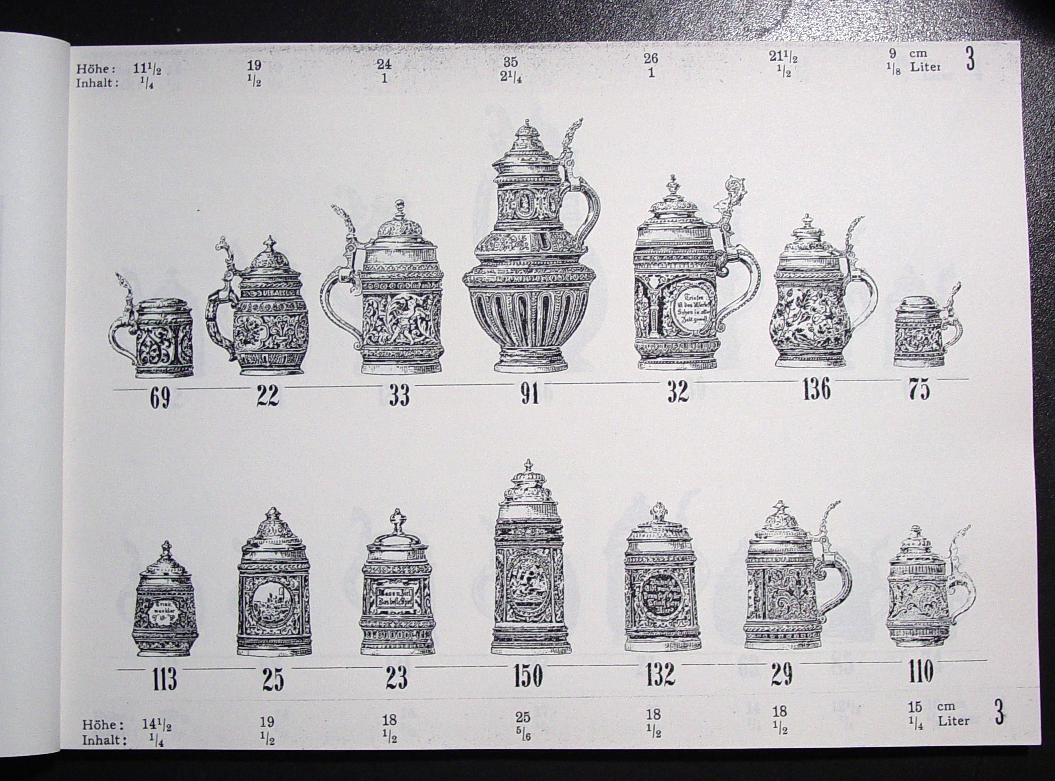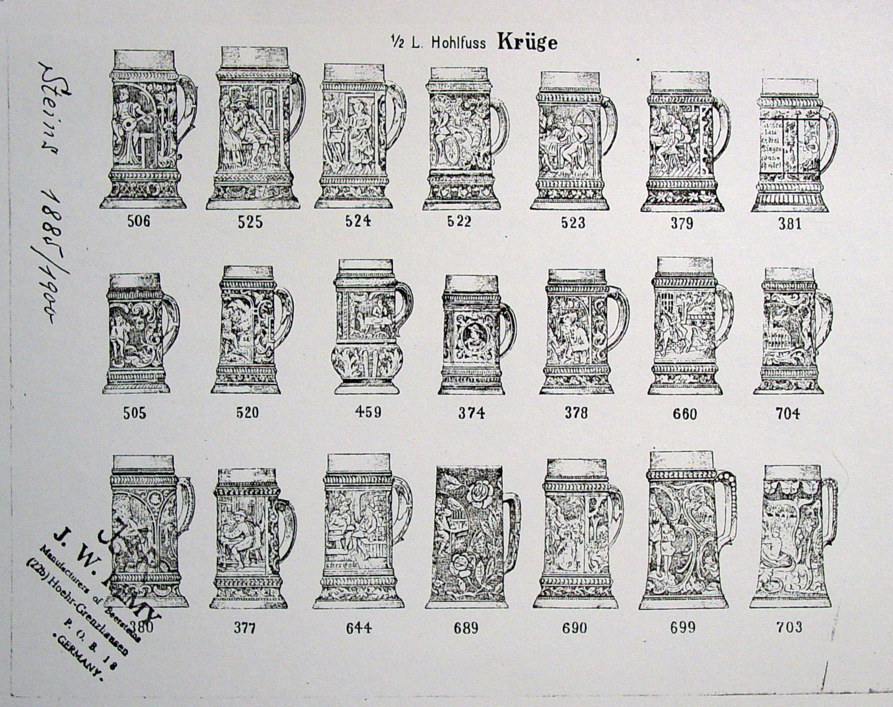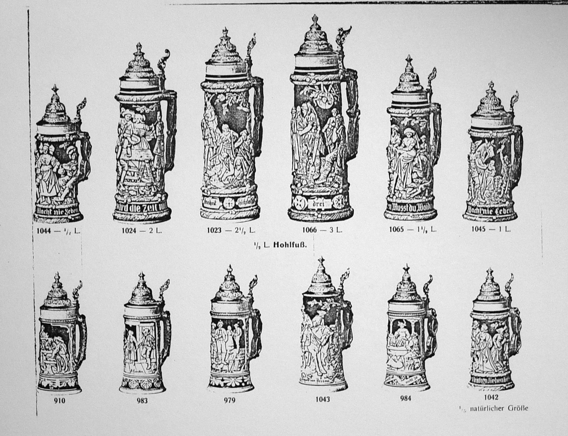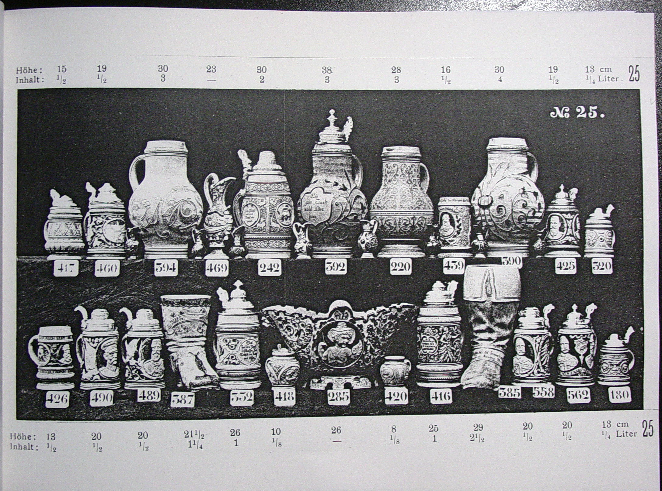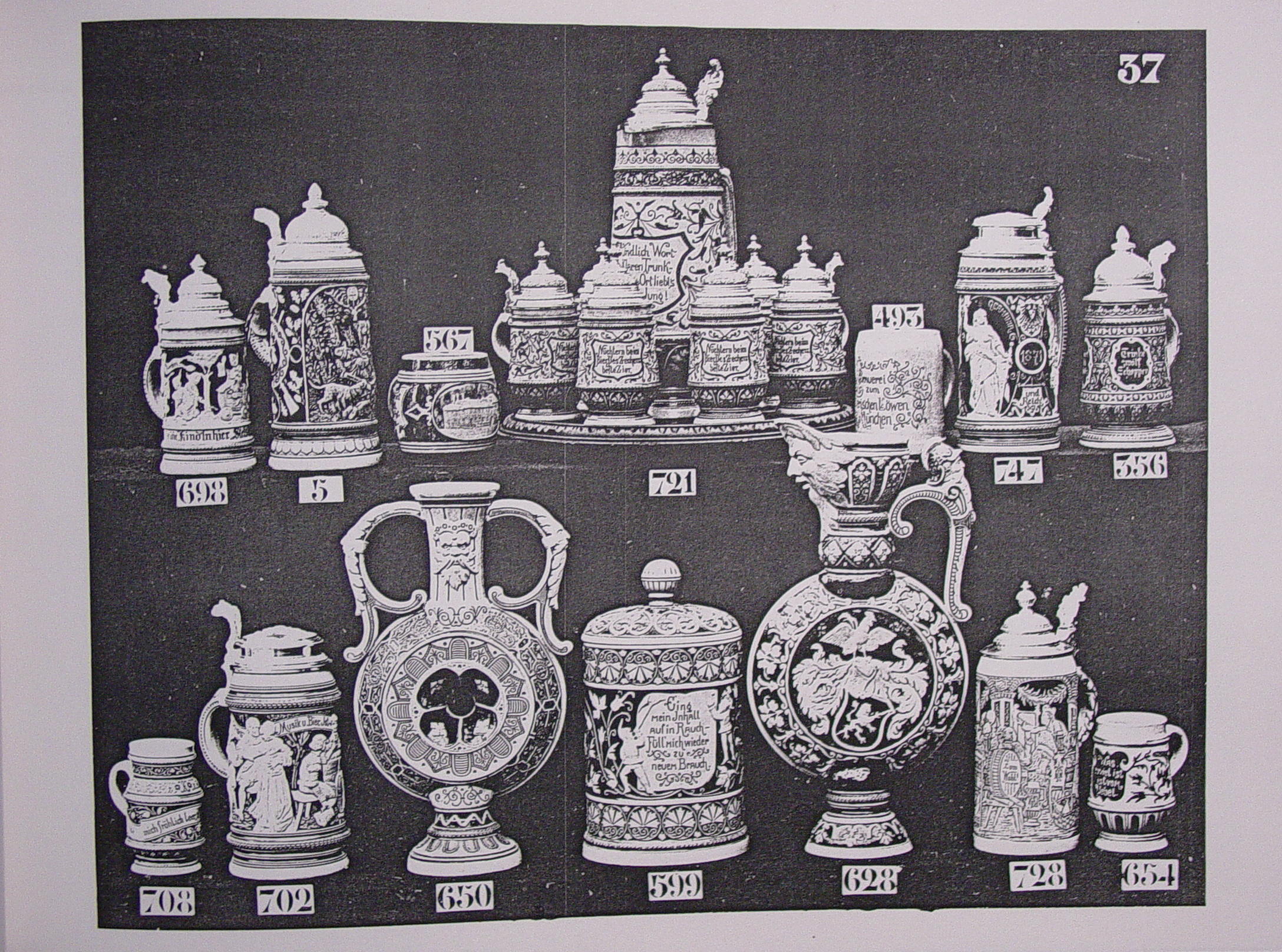 Who made this stein? Using available original manufacturers catalogs, this page allows you to look up possible answers to that question. Mold numbers beginning with 1 and ranging into the thousands appear in the first column below. For each mold number, the manufacturers who produced an item with that number are listed, along with a link to an original catalog page showing that item. Scroll down to the mold number in question, then examine the catalog pages to confirm the manufacturer of your stein.