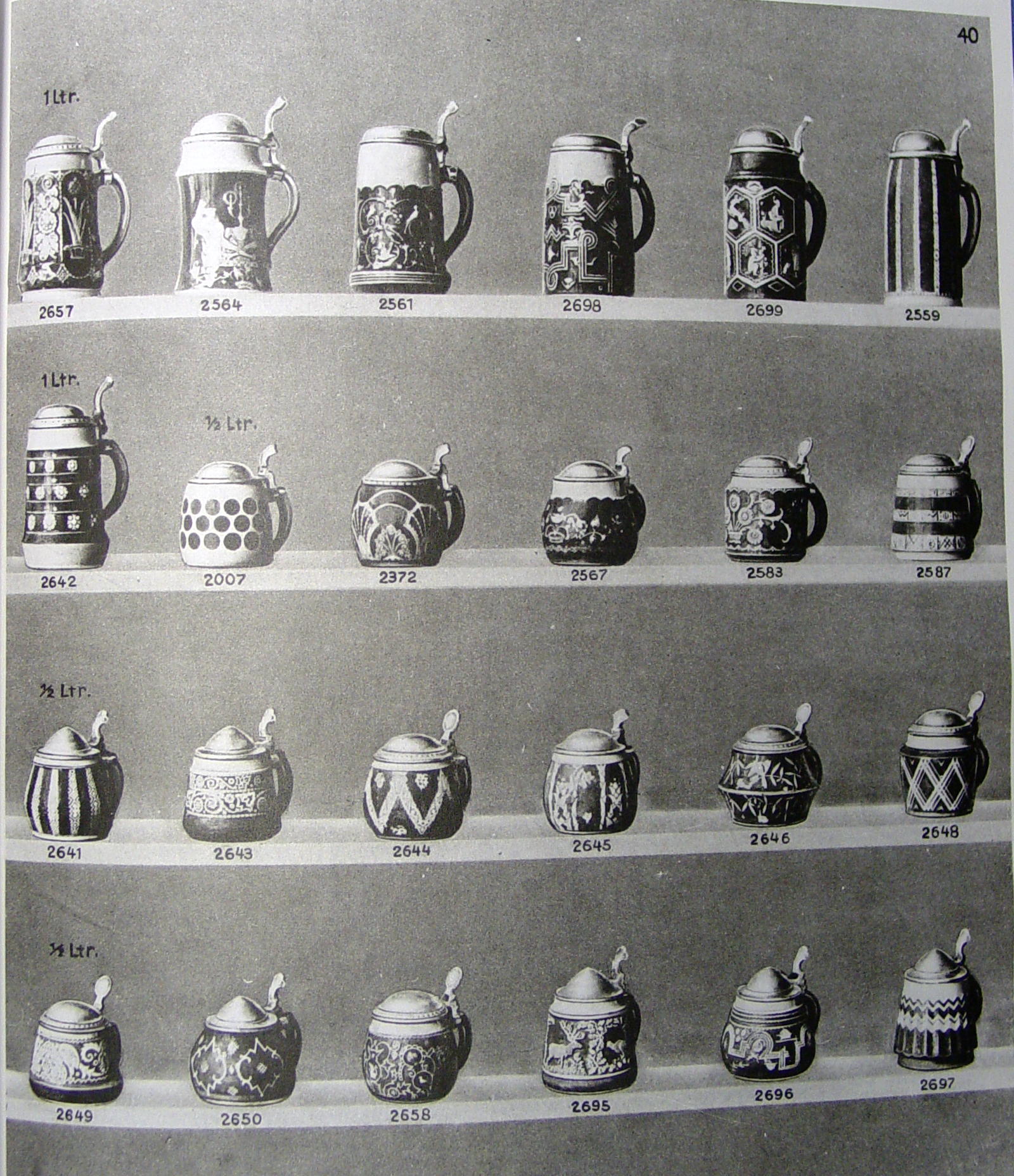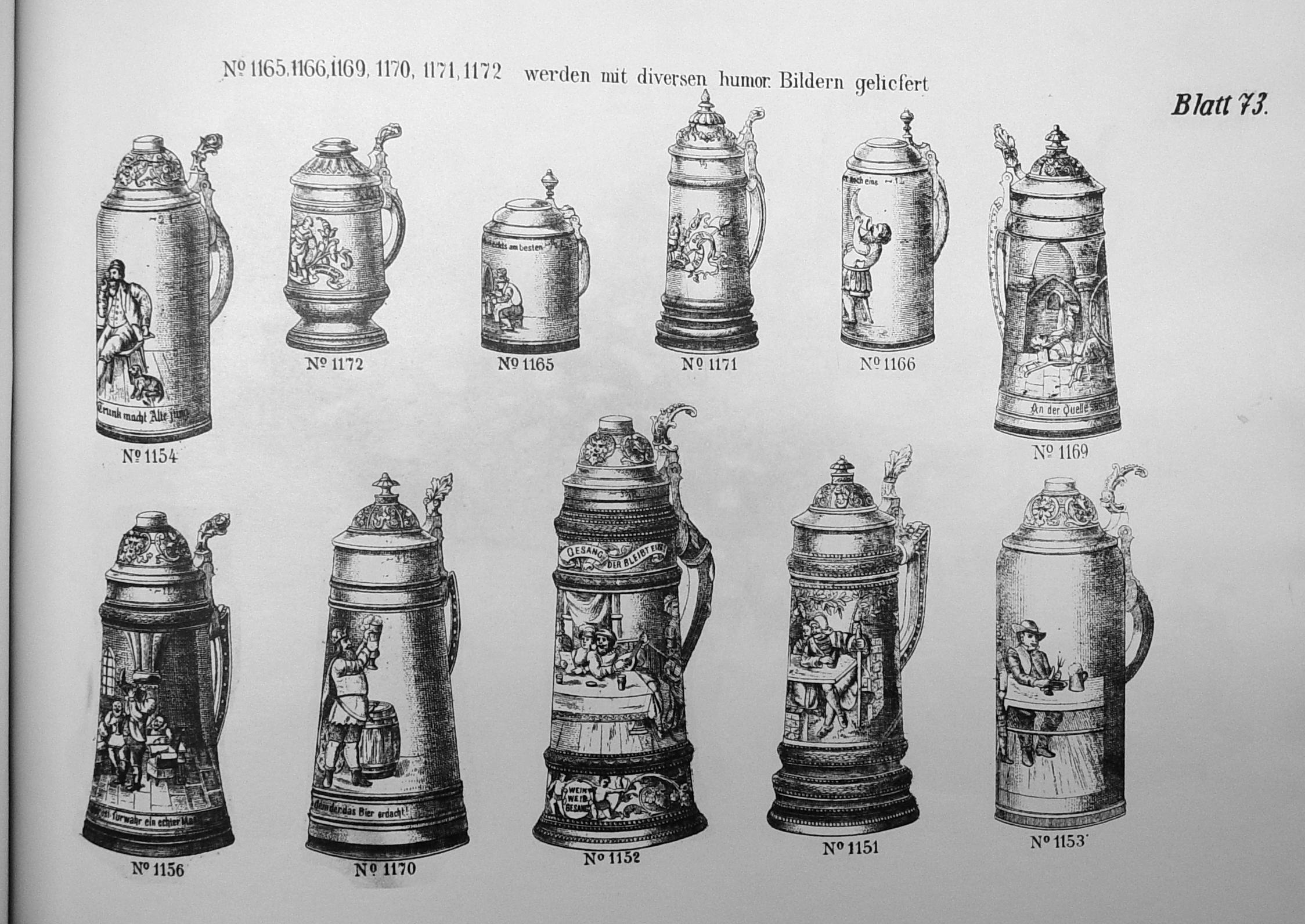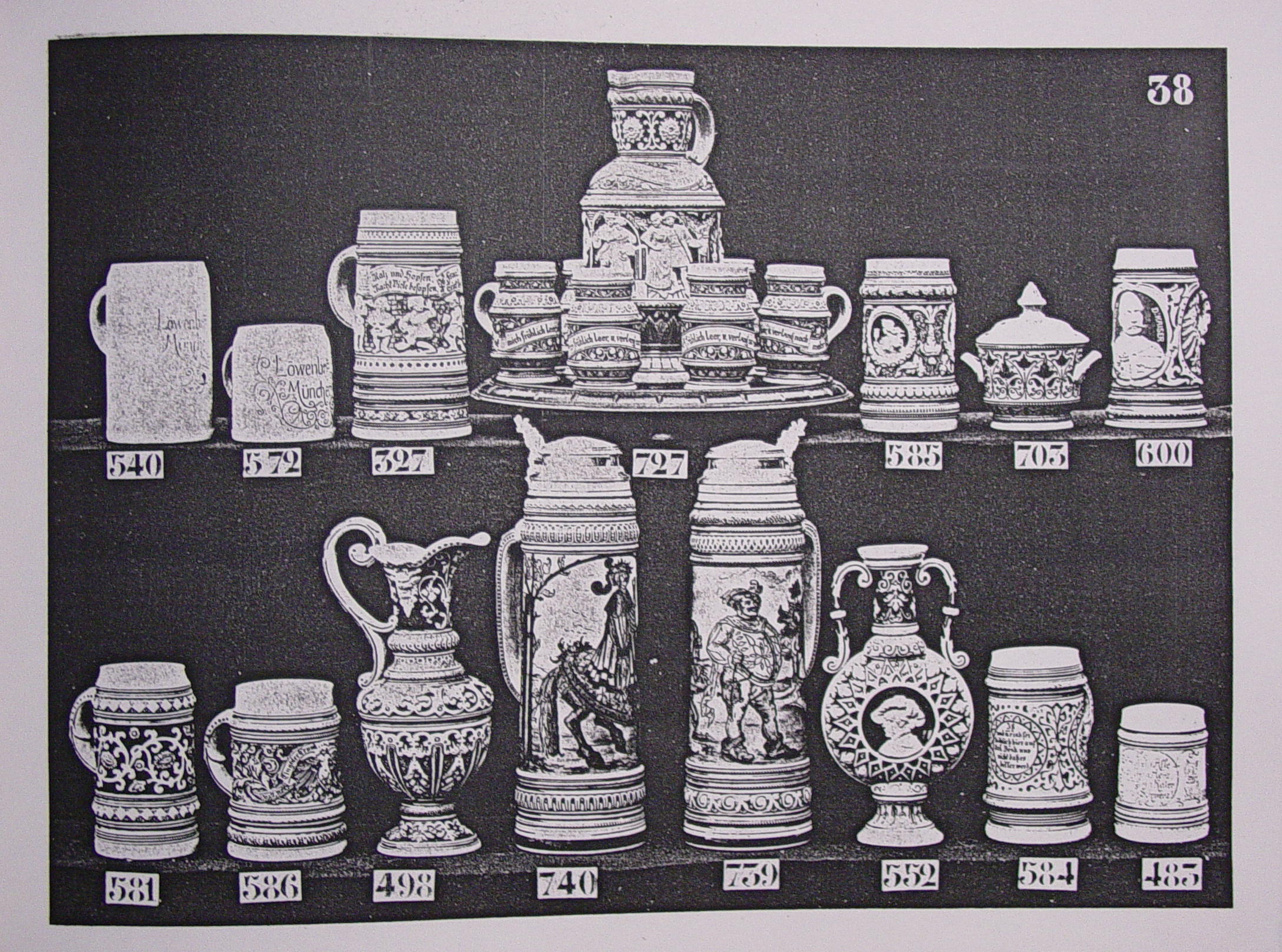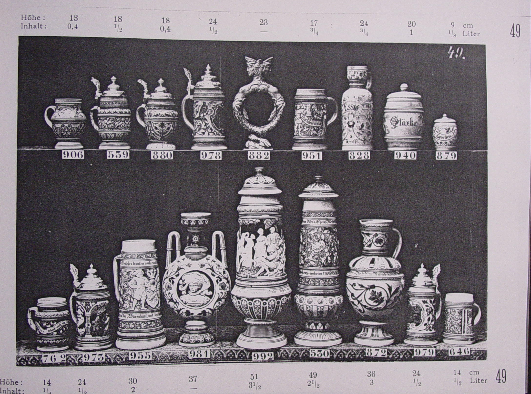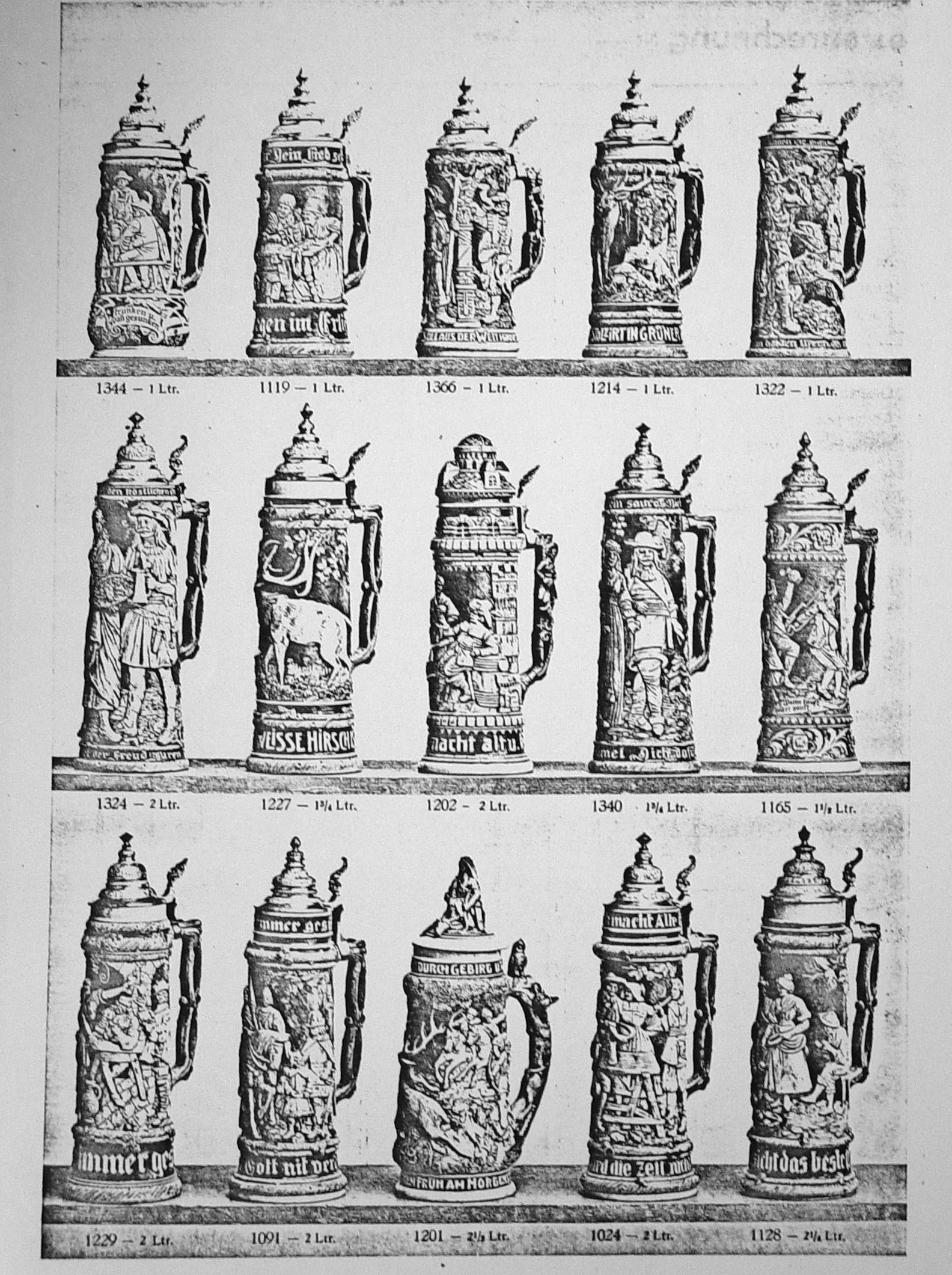 Who made this stein? Using available original manufacturers catalogs, this page allows you to look up possible answers to that question. Mold numbers beginning with 1 and ranging into the thousands appear in the first column below. For each mold number, the manufacturers who produced an item with that number are listed, along with a link to an original catalog page showing that item. Scroll down to the mold number in question, then examine the catalog pages to confirm the manufacturer of your stein.