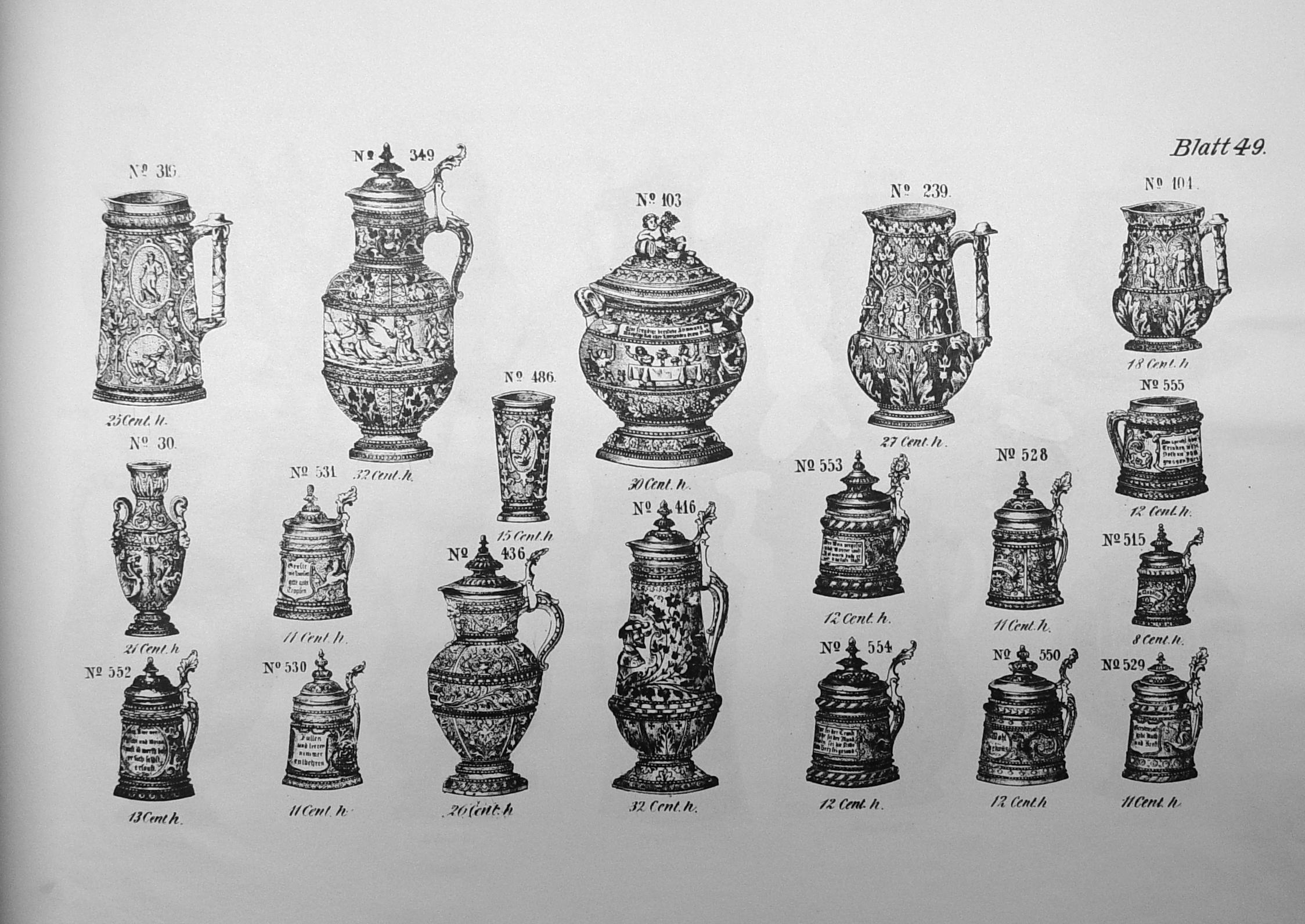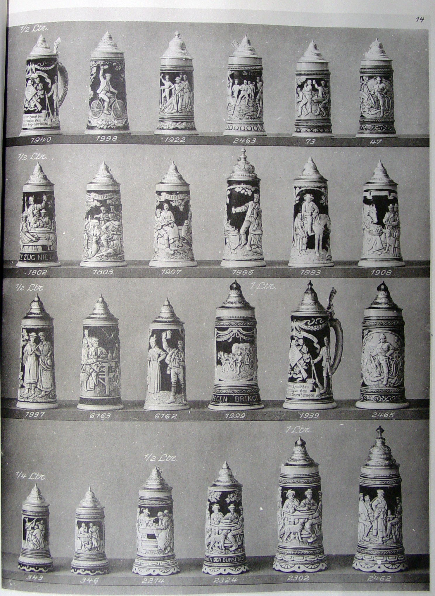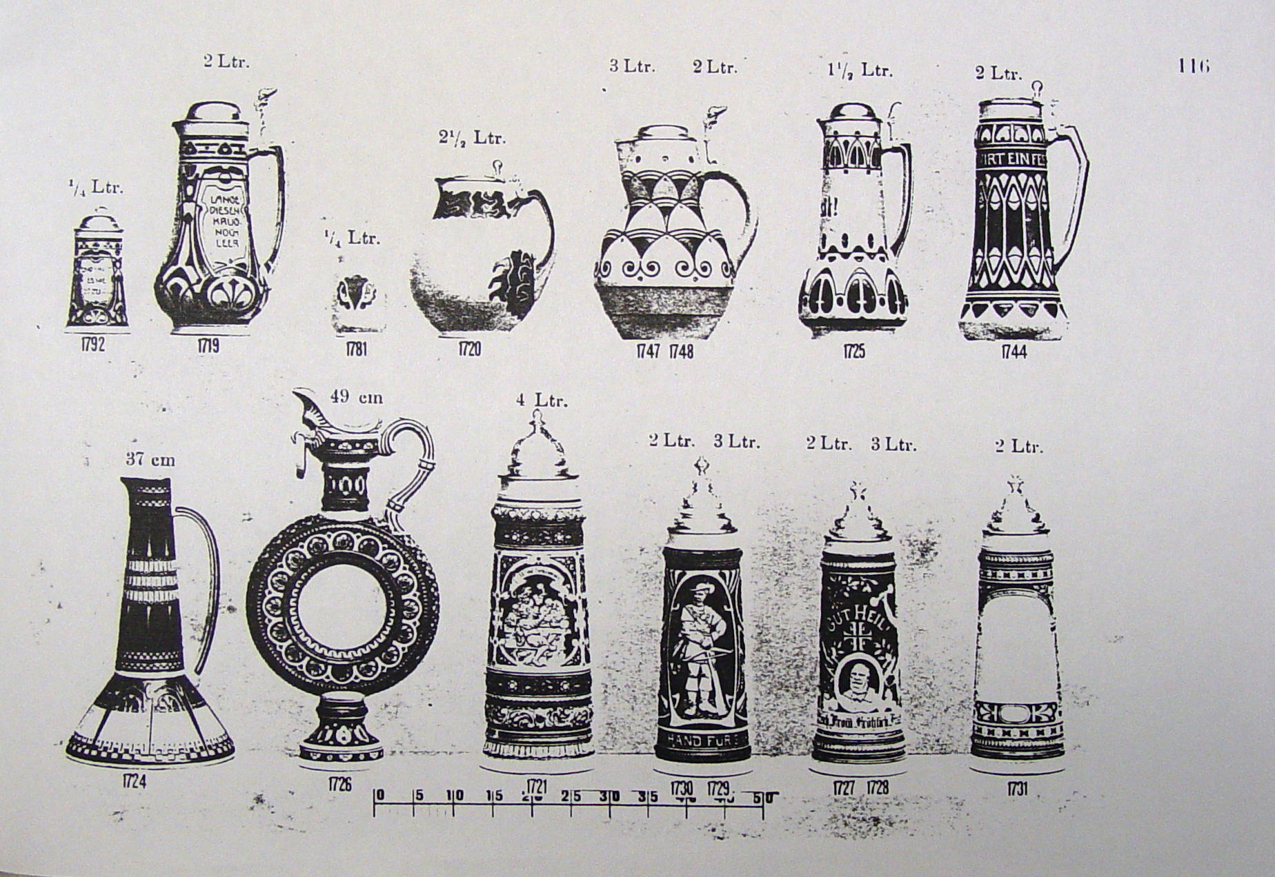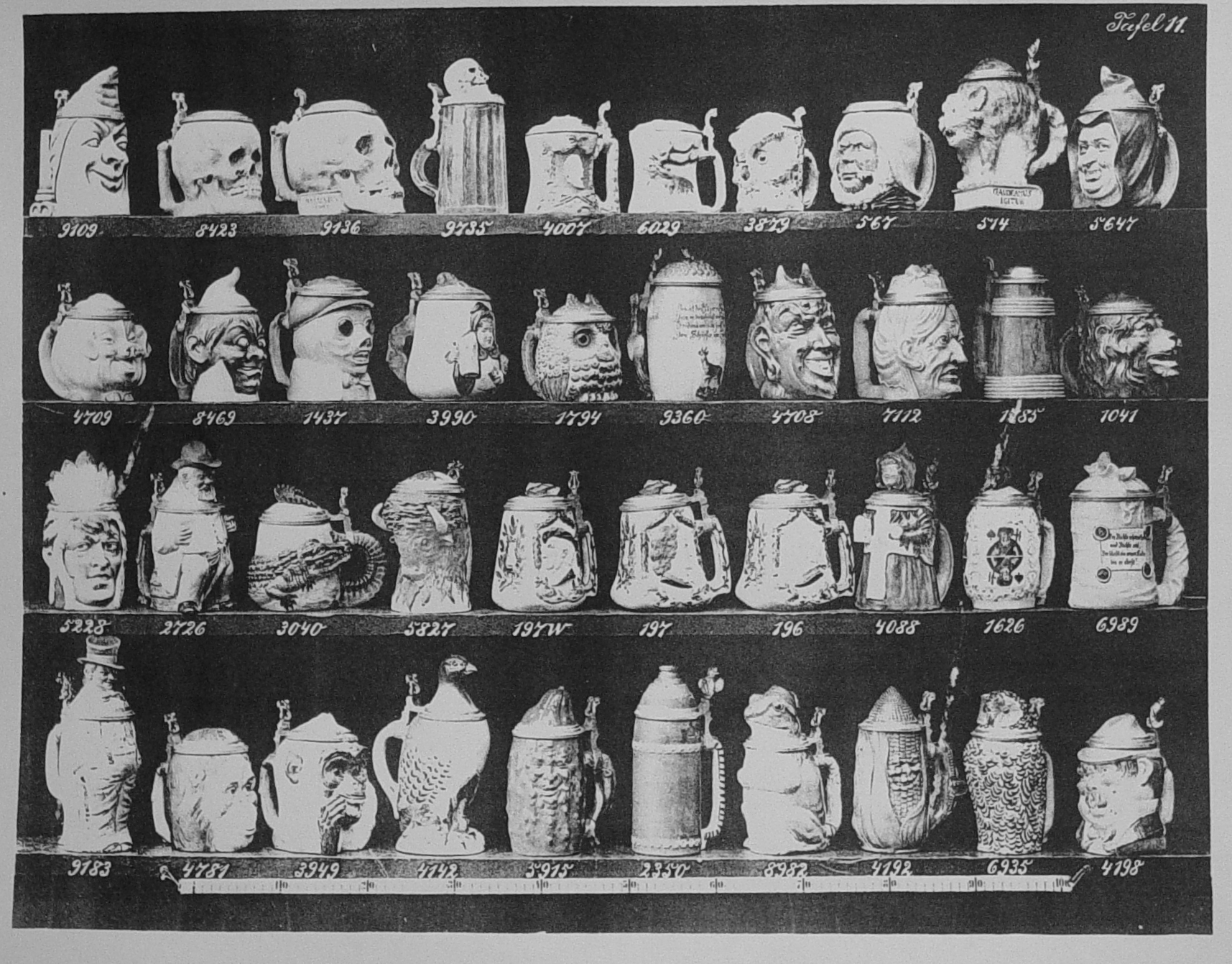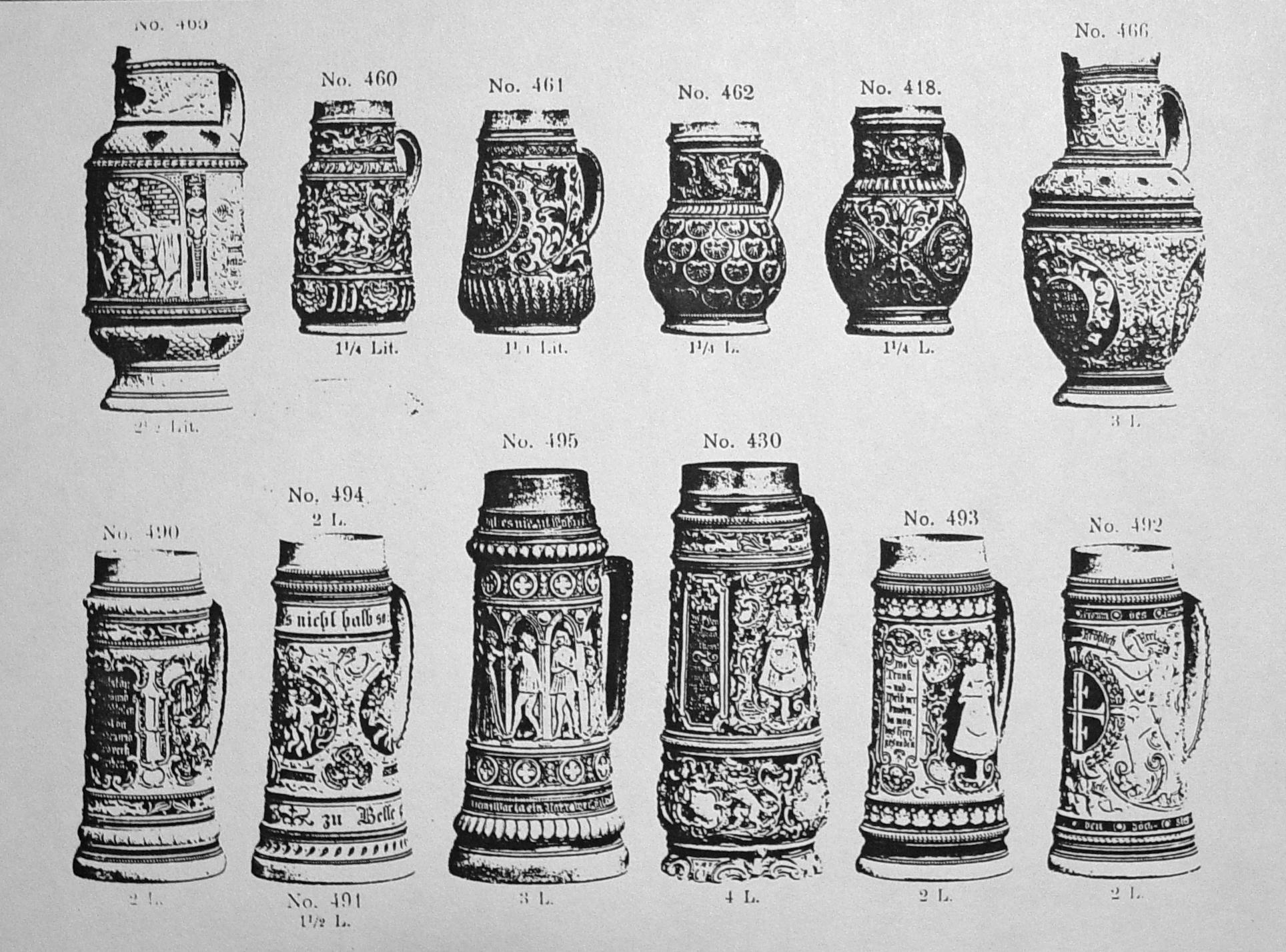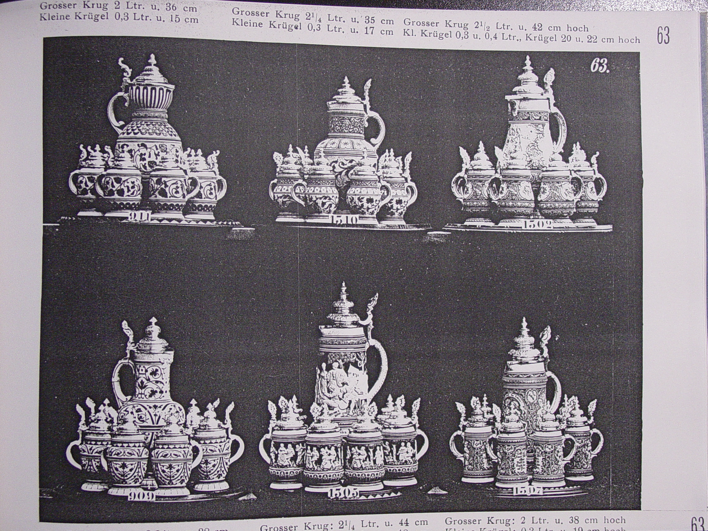 Who made this stein? Using available original manufacturers catalogs, this page allows you to look up possible answers to that question. Mold numbers beginning with 1 and ranging into the thousands appear in the first column below. For each mold number, the manufacturers who produced an item with that number are listed, along with a link to an original catalog page showing that item. Scroll down to the mold number in question, then examine the catalog pages to confirm the manufacturer of your stein.
