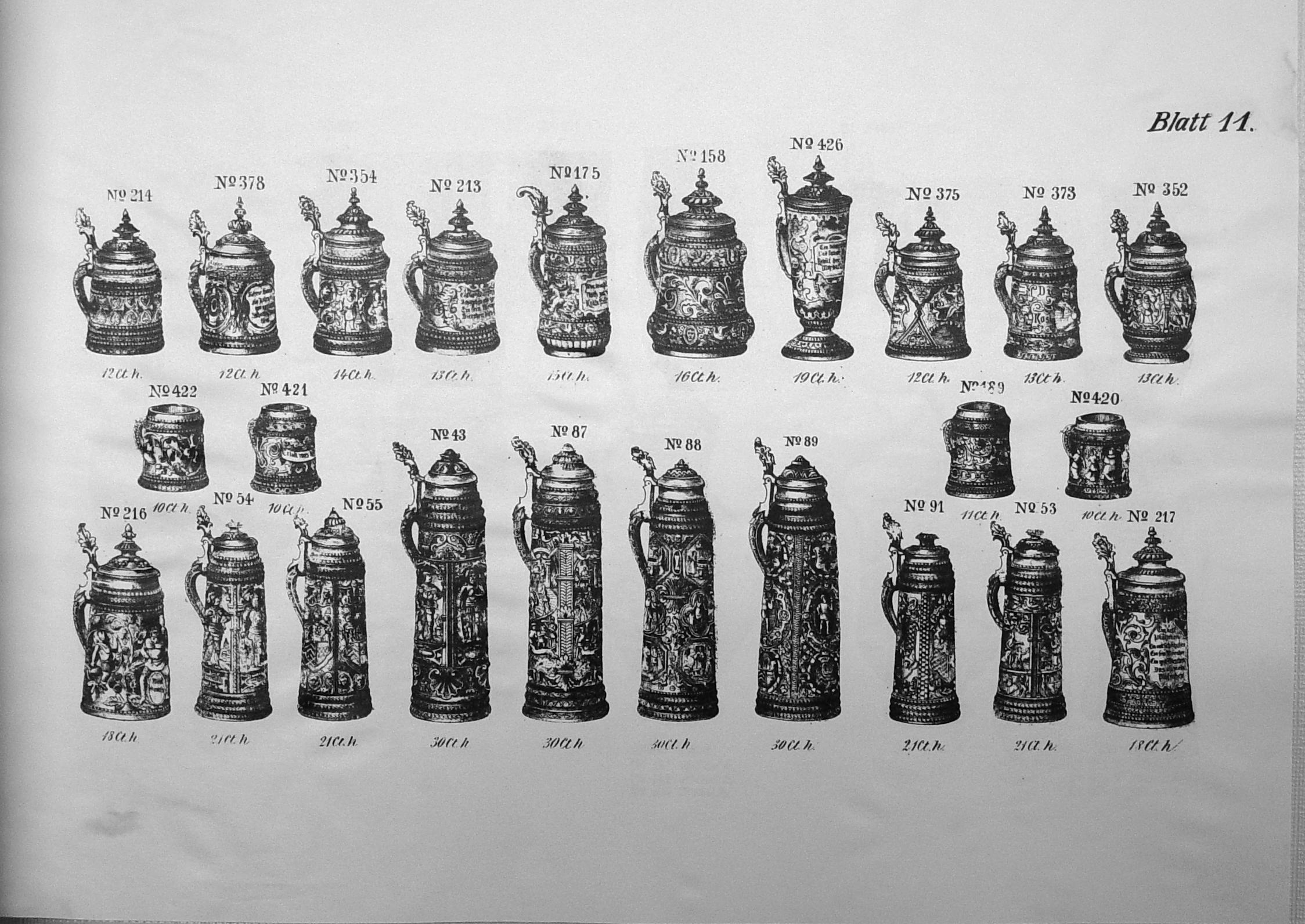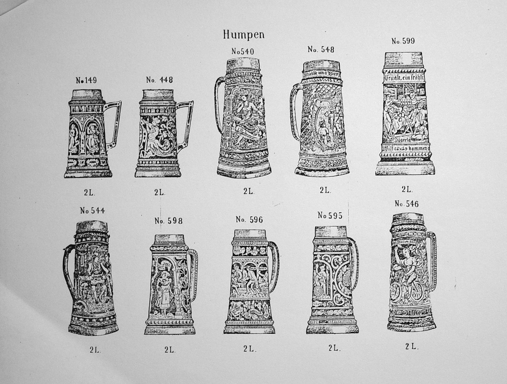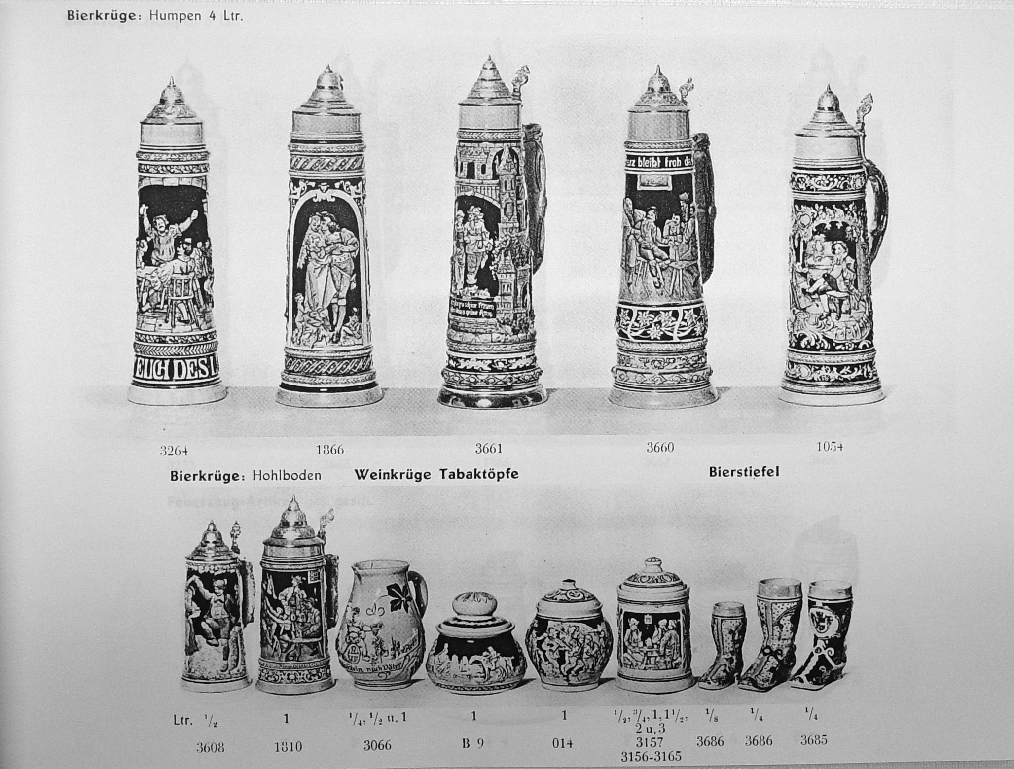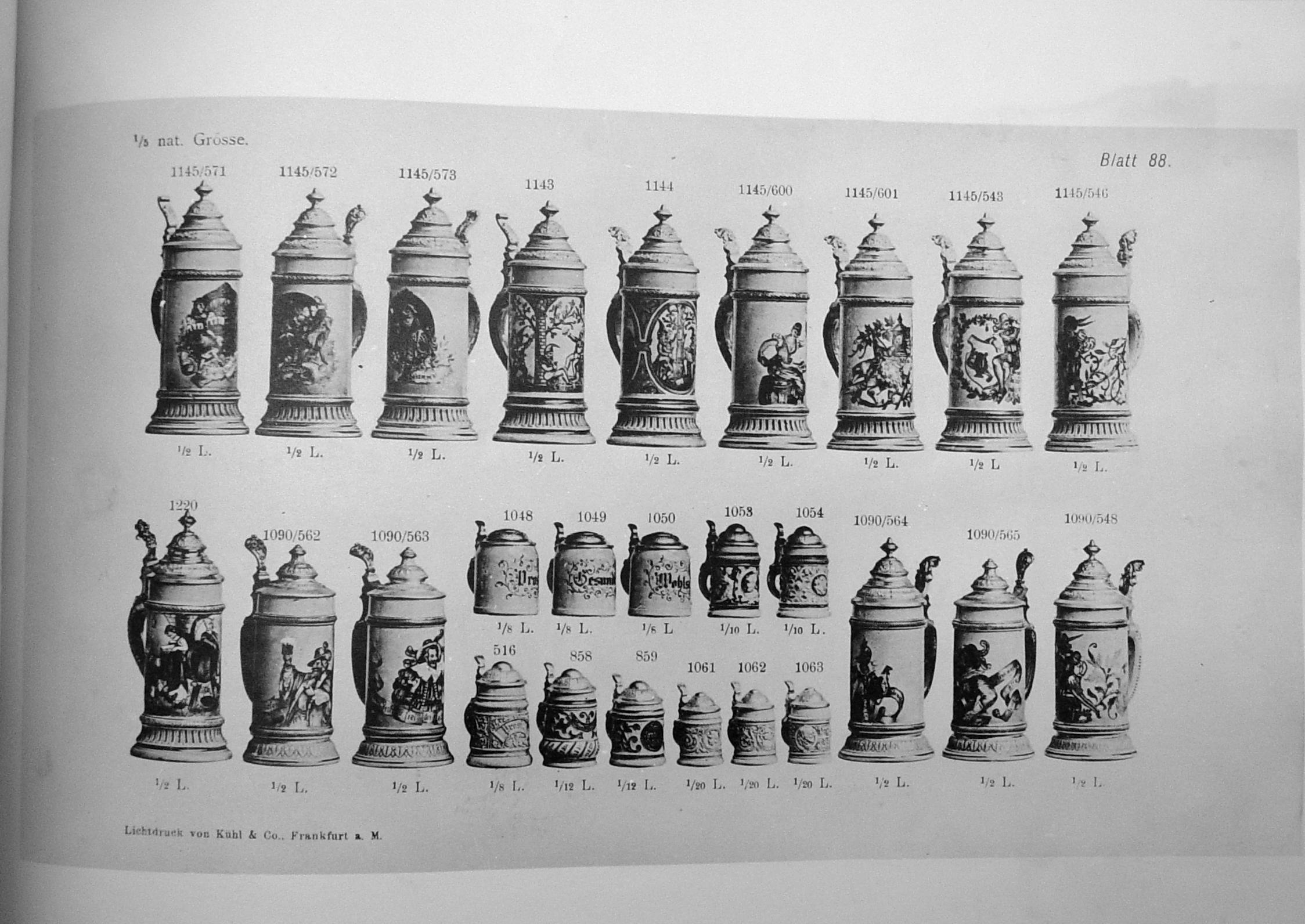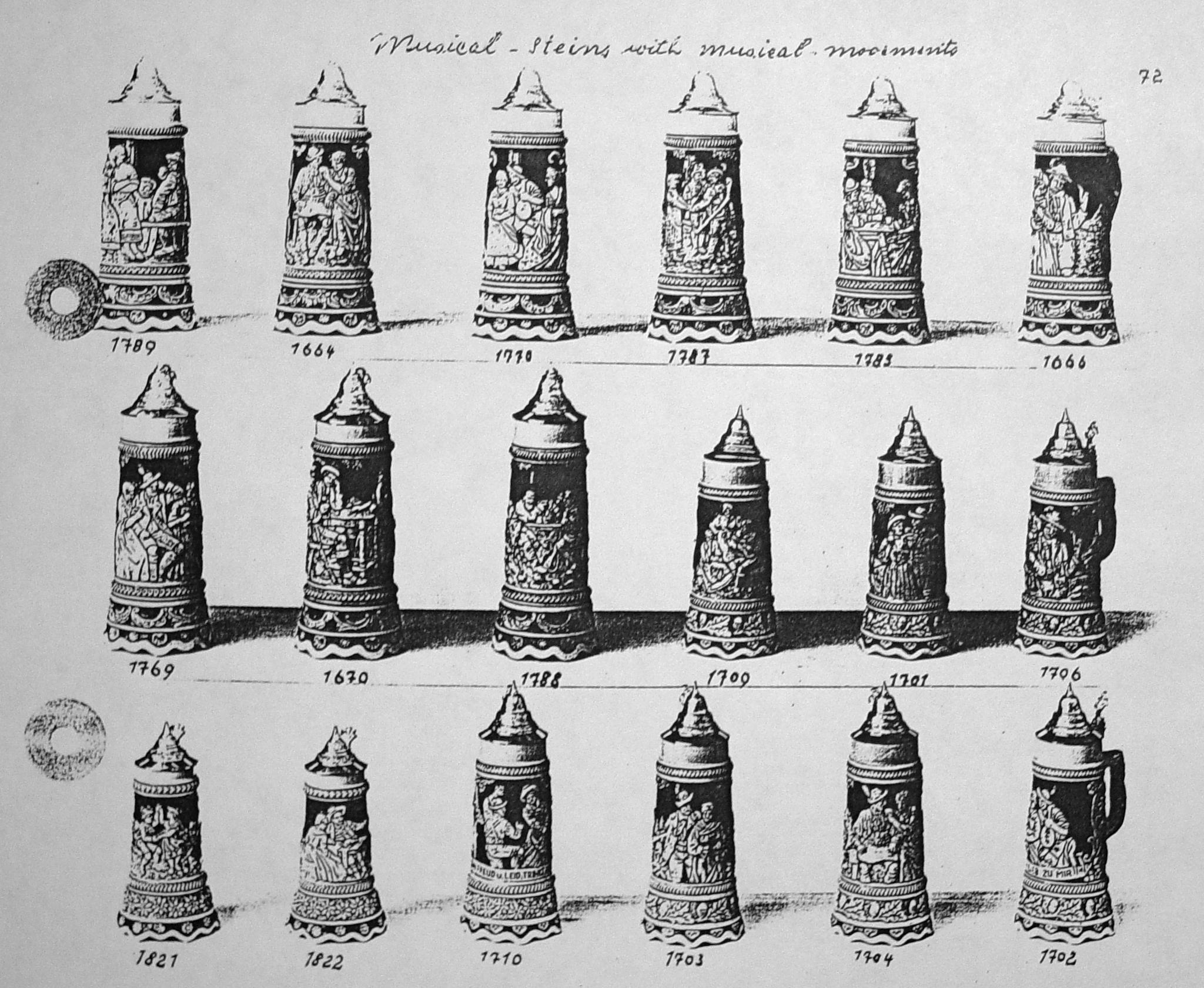 Who made this stein? Using available original manufacturers catalogs, this page allows you to look up possible answers to that question. Mold numbers beginning with 1 and ranging into the thousands appear in the first column below. For each mold number, the manufacturers who produced an item with that number are listed, along with a link to an original catalog page showing that item. Scroll down to the mold number in question, then examine the catalog pages to confirm the manufacturer of your stein.