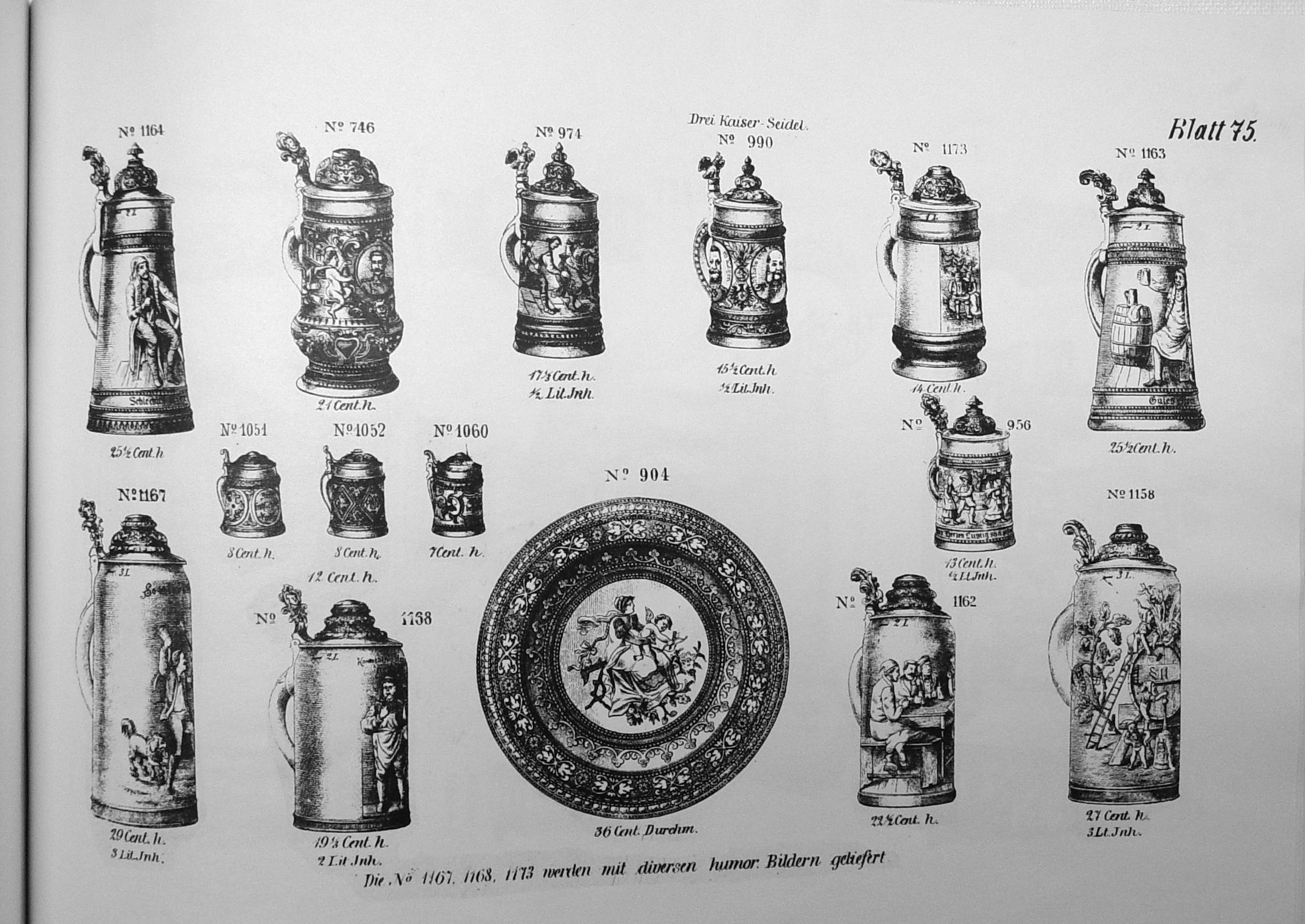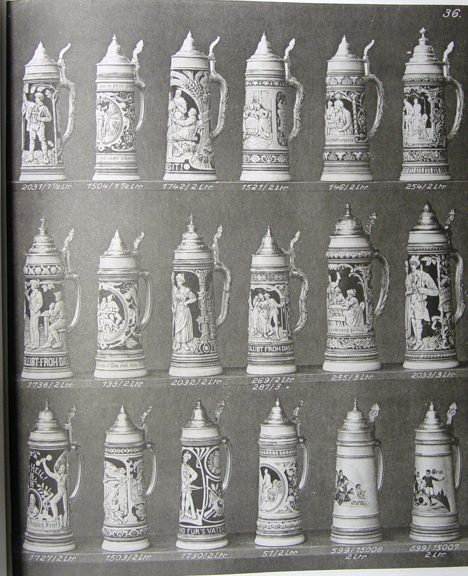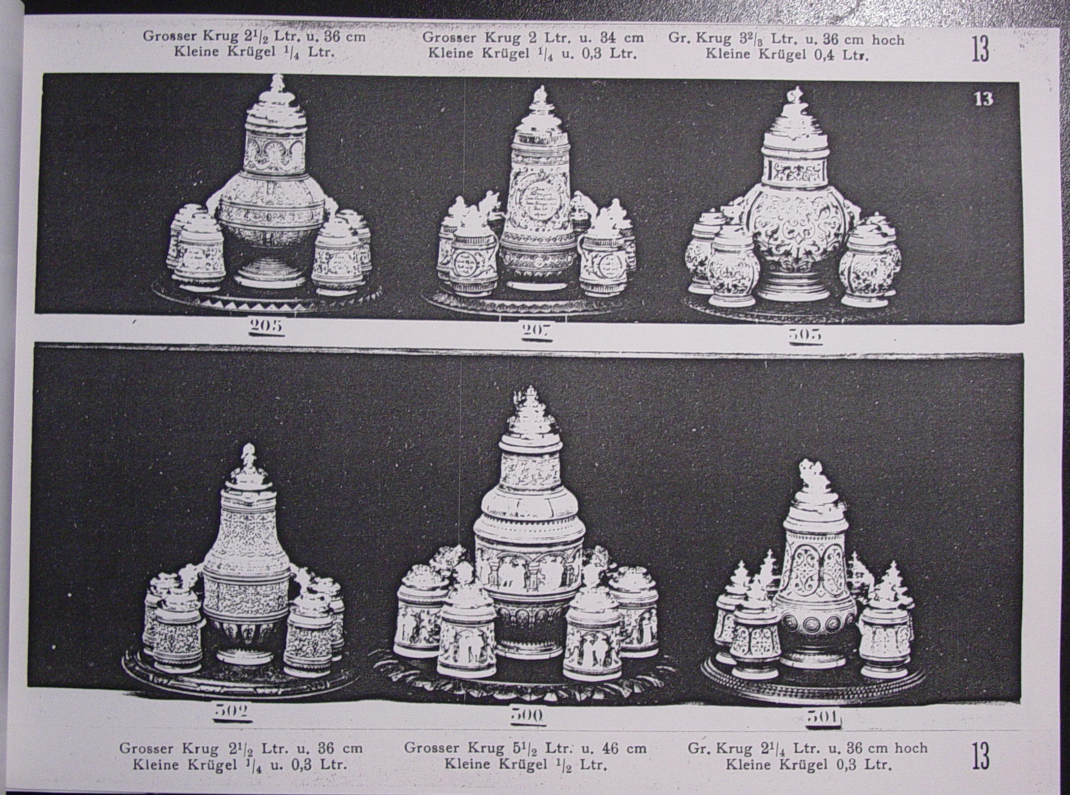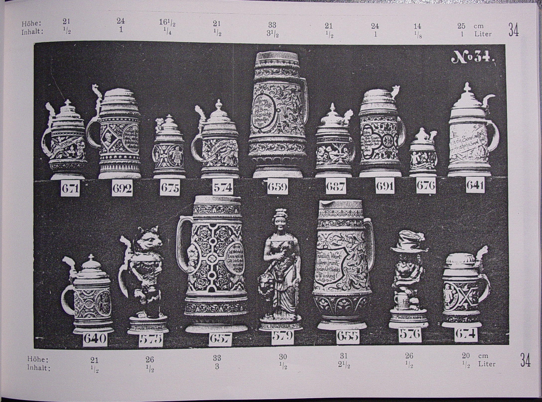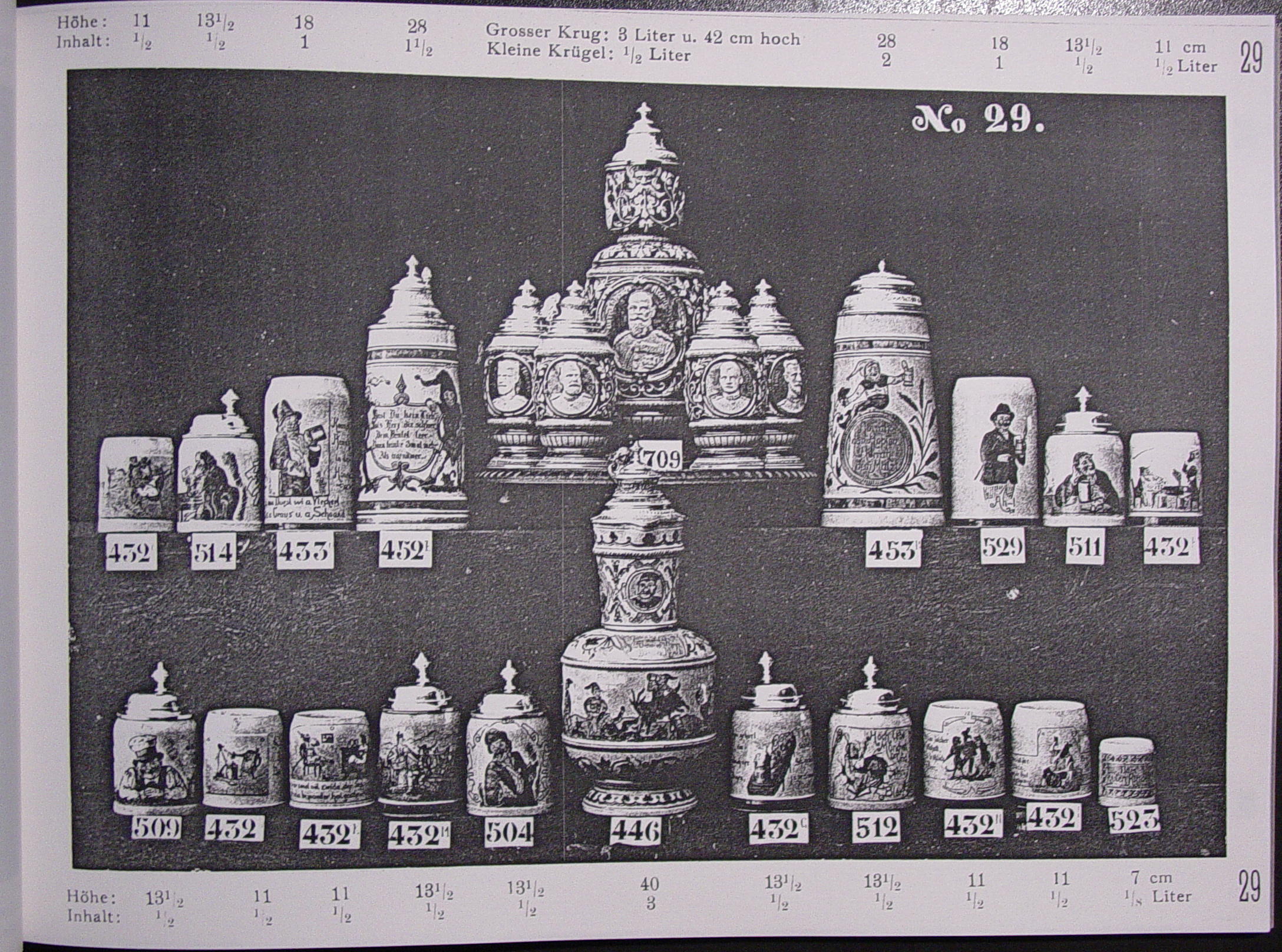 Who made this stein? Using available original manufacturers catalogs, this page allows you to look up possible answers to that question. Mold numbers beginning with 1 and ranging into the thousands appear in the first column below. For each mold number, the manufacturers who produced an item with that number are listed, along with a link to an original catalog page showing that item. Scroll down to the mold number in question, then examine the catalog pages to confirm the manufacturer of your stein.