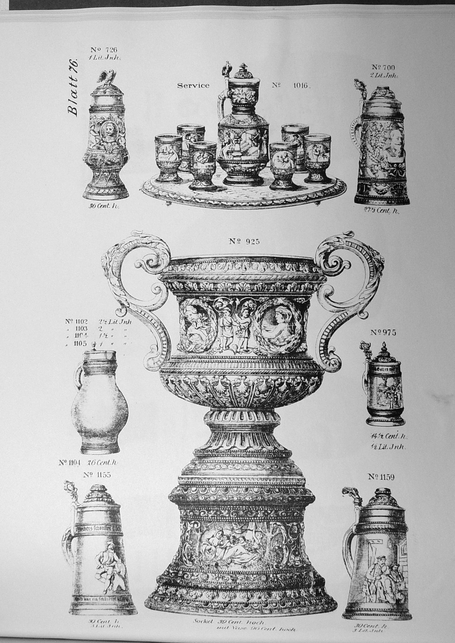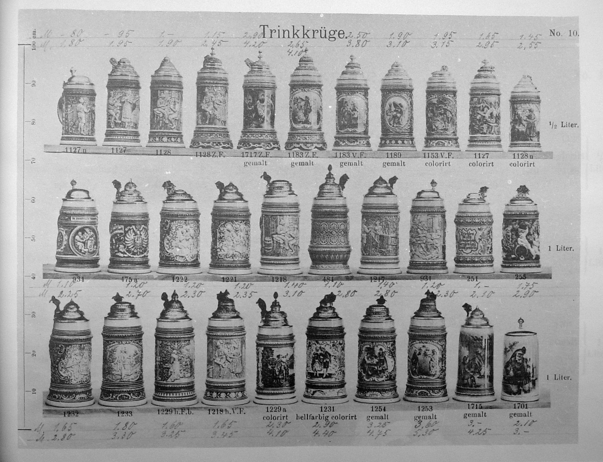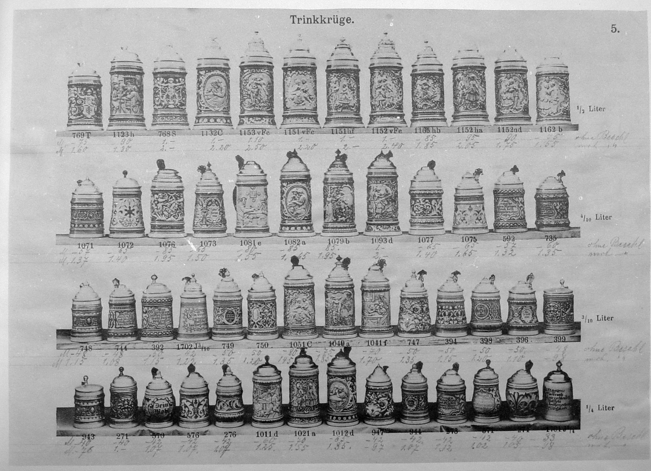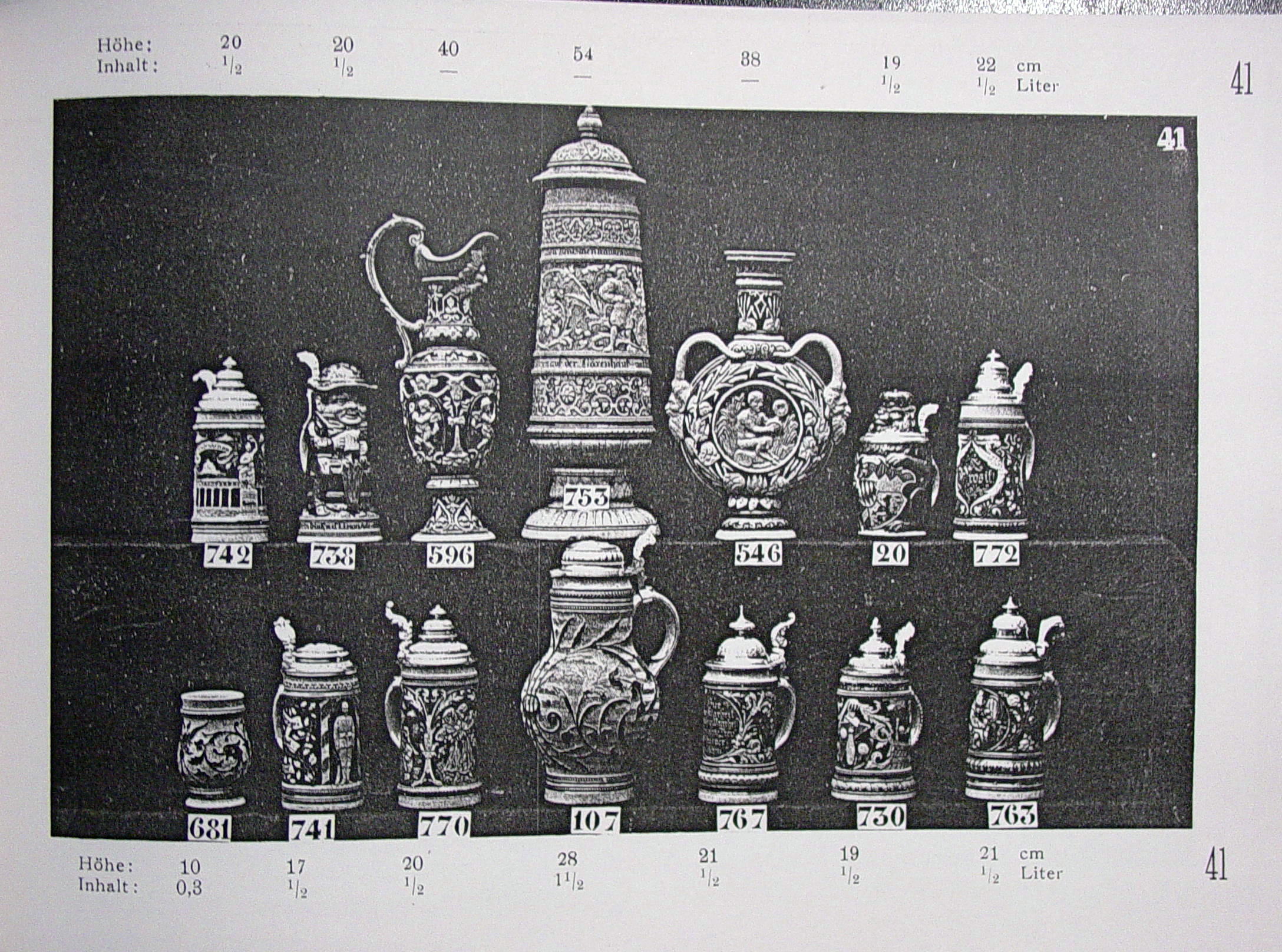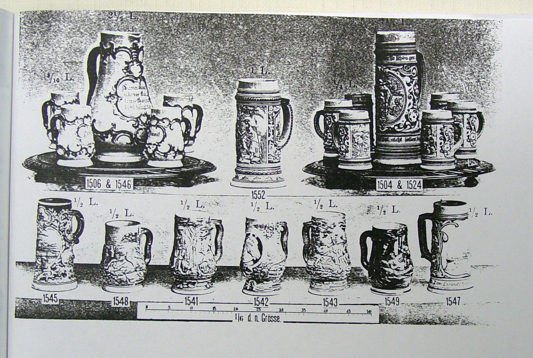 Who made this stein? Using available original manufacturers catalogs, this page allows you to look up possible answers to that question. Mold numbers beginning with 1 and ranging into the thousands appear in the first column below. For each mold number, the manufacturers who produced an item with that number are listed, along with a link to an original catalog page showing that item. Scroll down to the mold number in question, then examine the catalog pages to confirm the manufacturer of your stein.