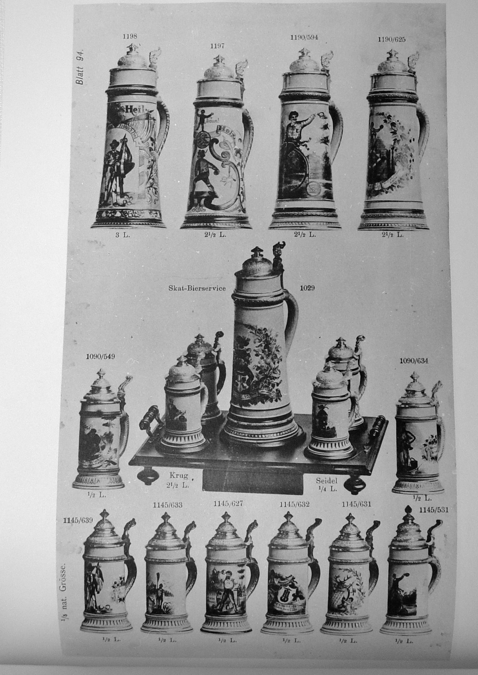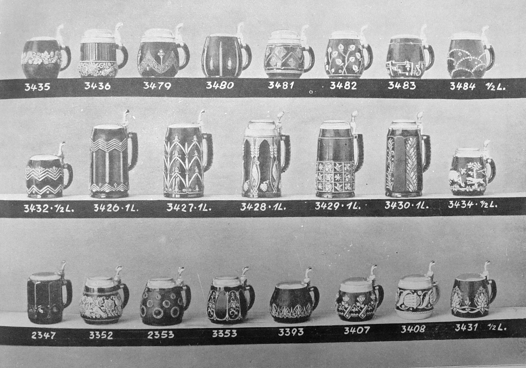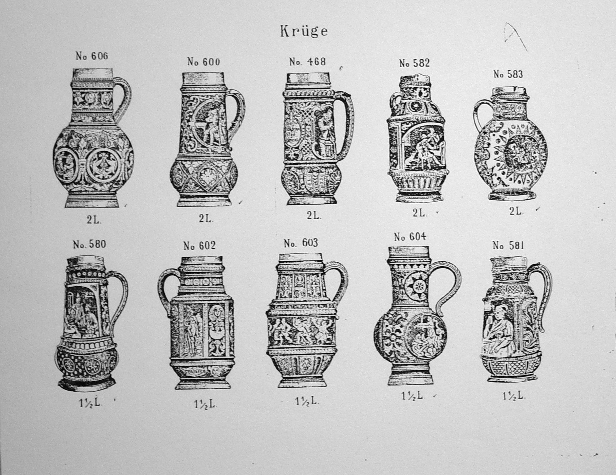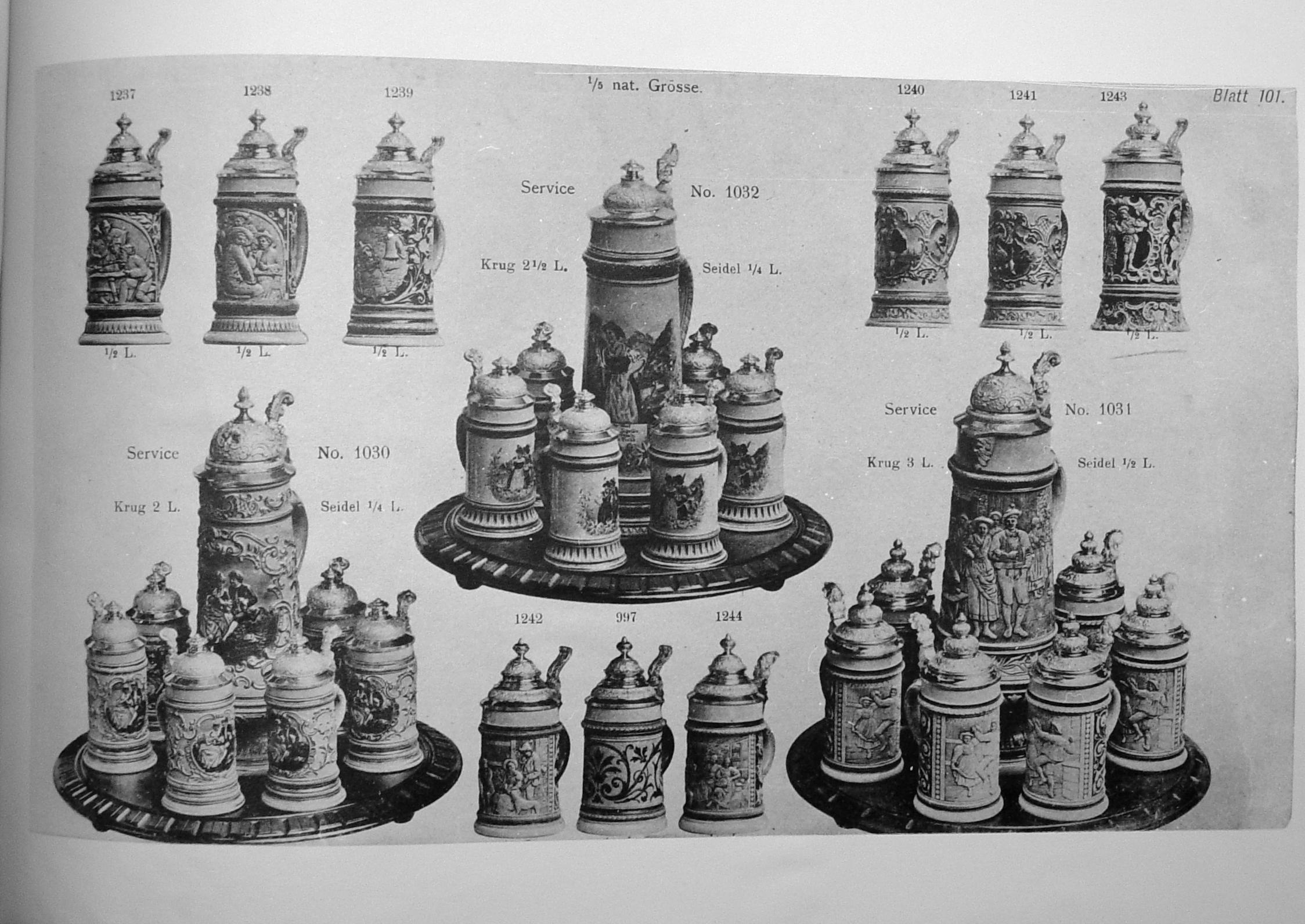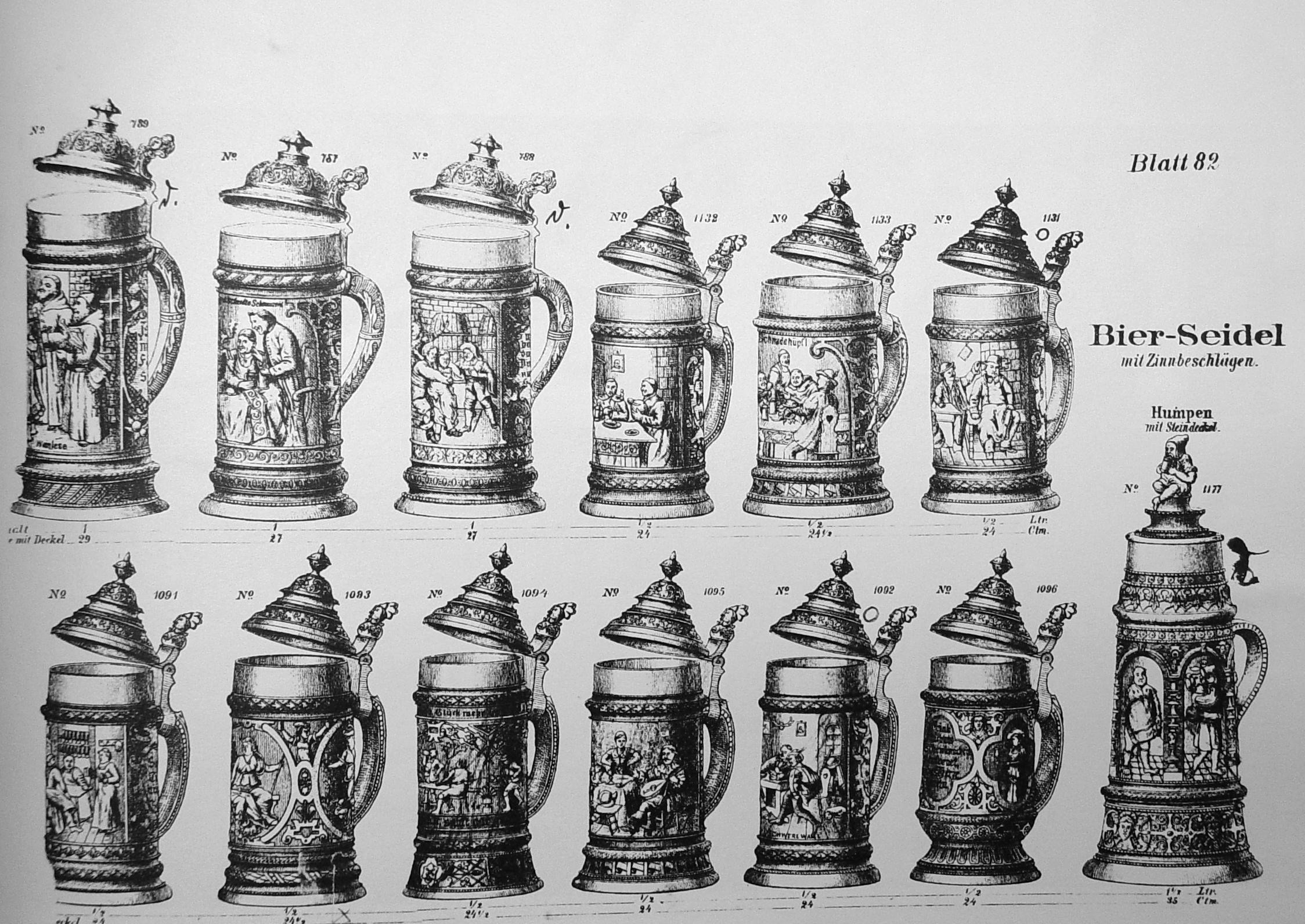 Who made this stein? Using available original manufacturers catalogs, this page allows you to look up possible answers to that question. Mold numbers beginning with 1 and ranging into the thousands appear in the first column below. For each mold number, the manufacturers who produced an item with that number are listed, along with a link to an original catalog page showing that item. Scroll down to the mold number in question, then examine the catalog pages to confirm the manufacturer of your stein.