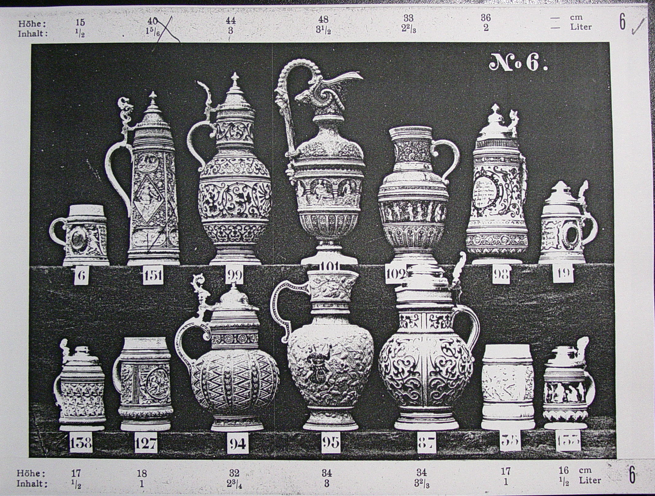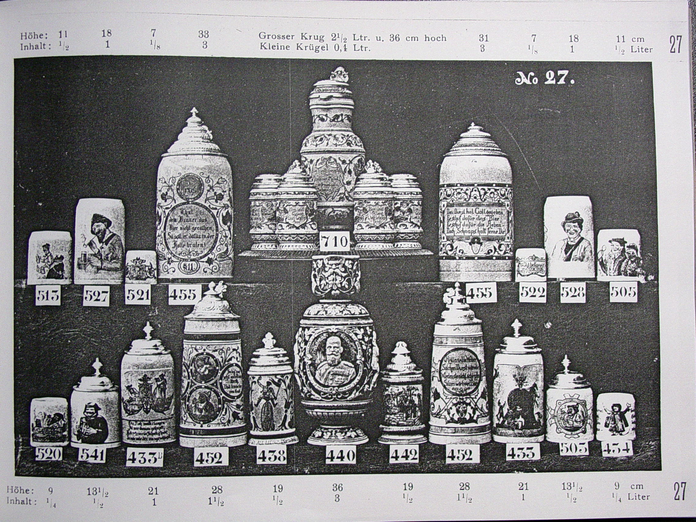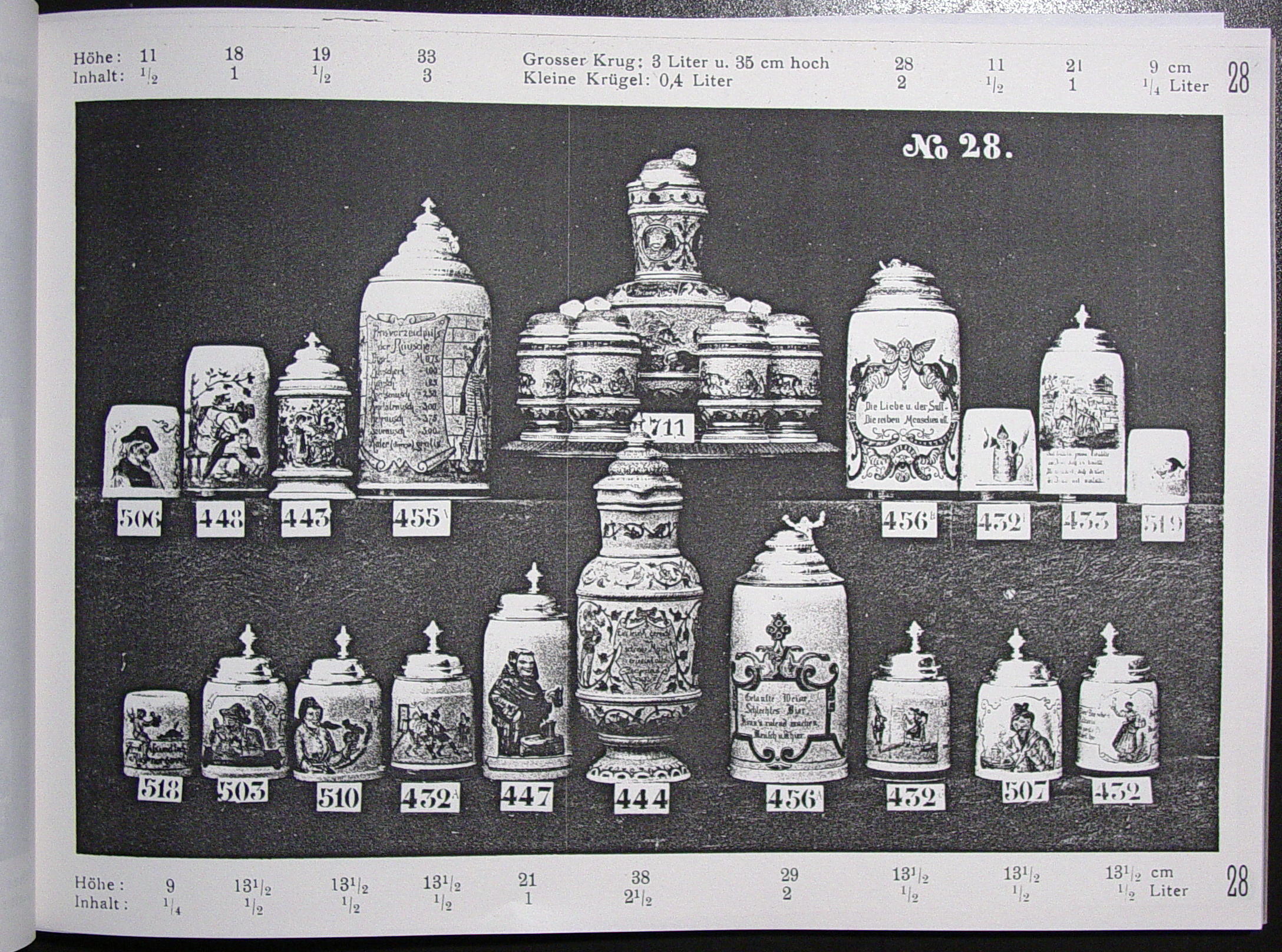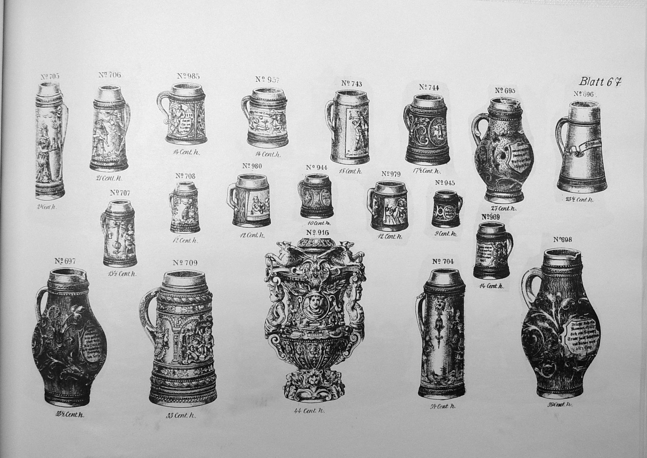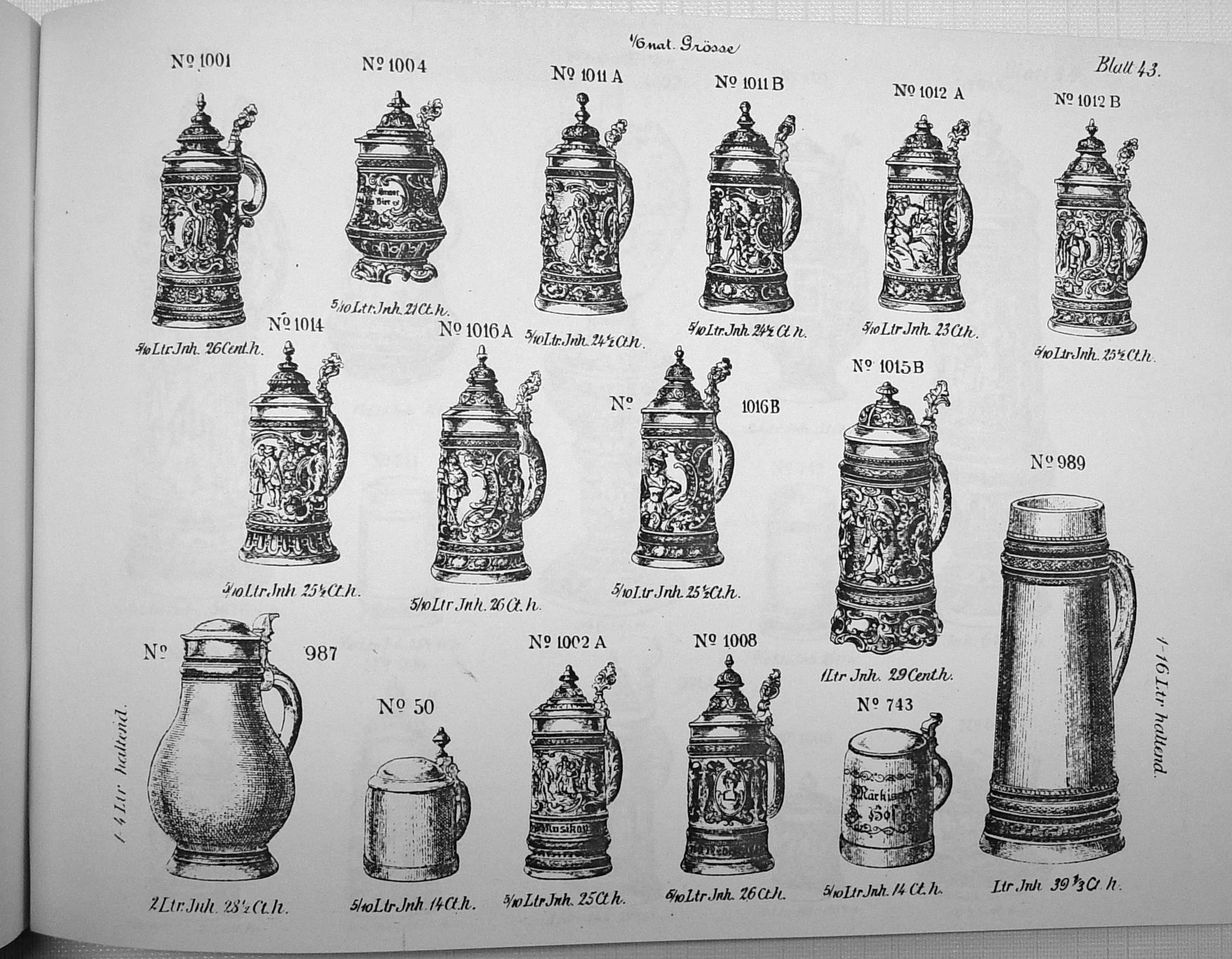 Who made this stein? Using available original manufacturers catalogs, this page allows you to look up possible answers to that question. Mold numbers beginning with 1 and ranging into the thousands appear in the first column below. For each mold number, the manufacturers who produced an item with that number are listed, along with a link to an original catalog page showing that item. Scroll down to the mold number in question, then examine the catalog pages to confirm the manufacturer of your stein.