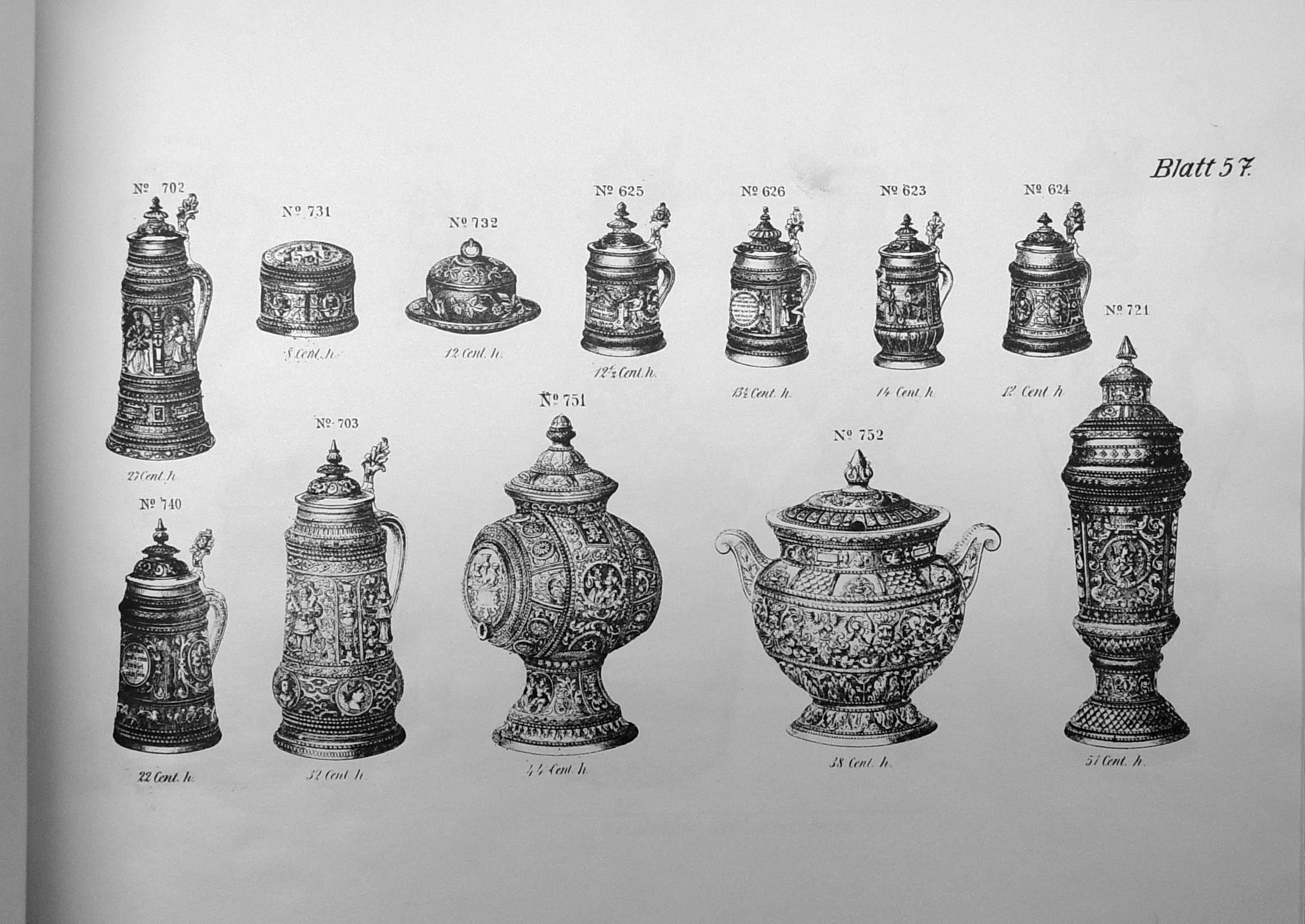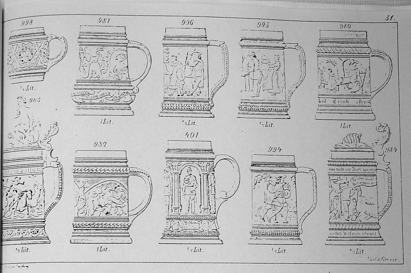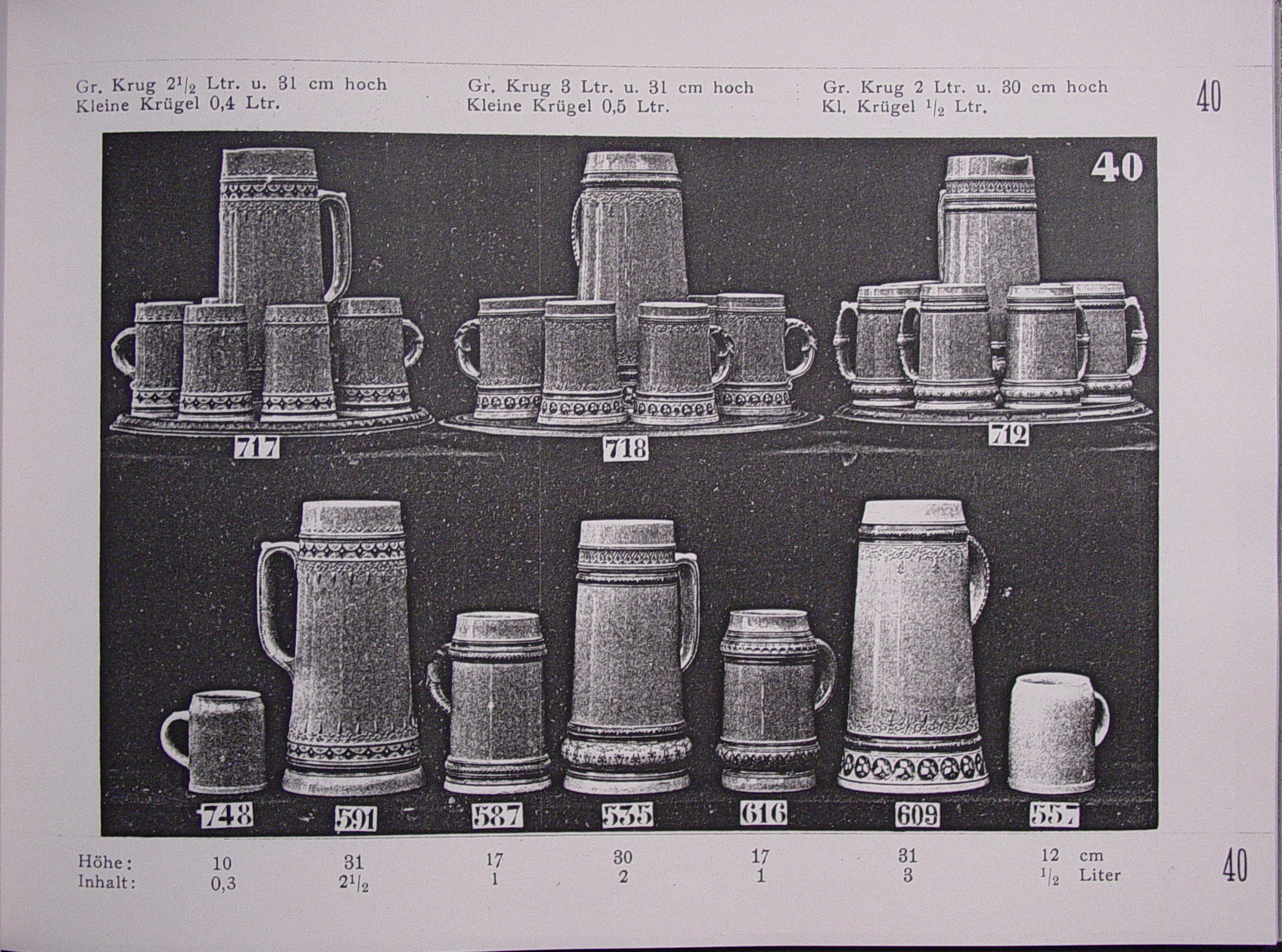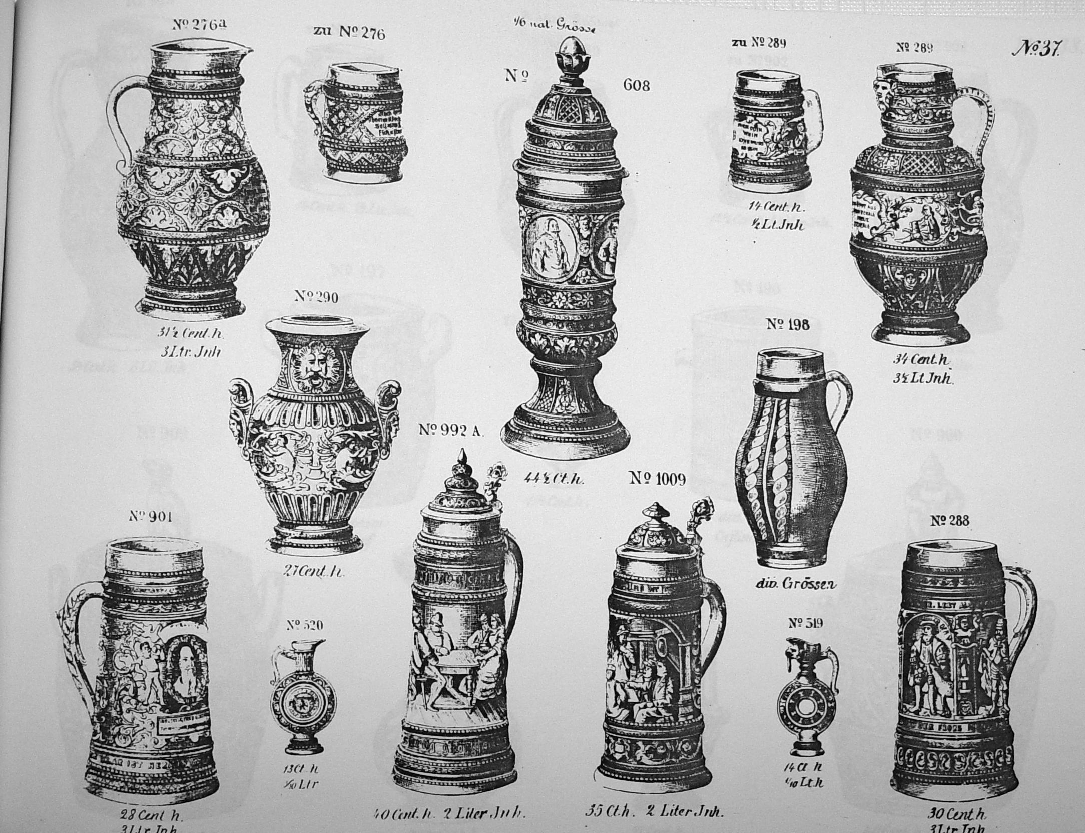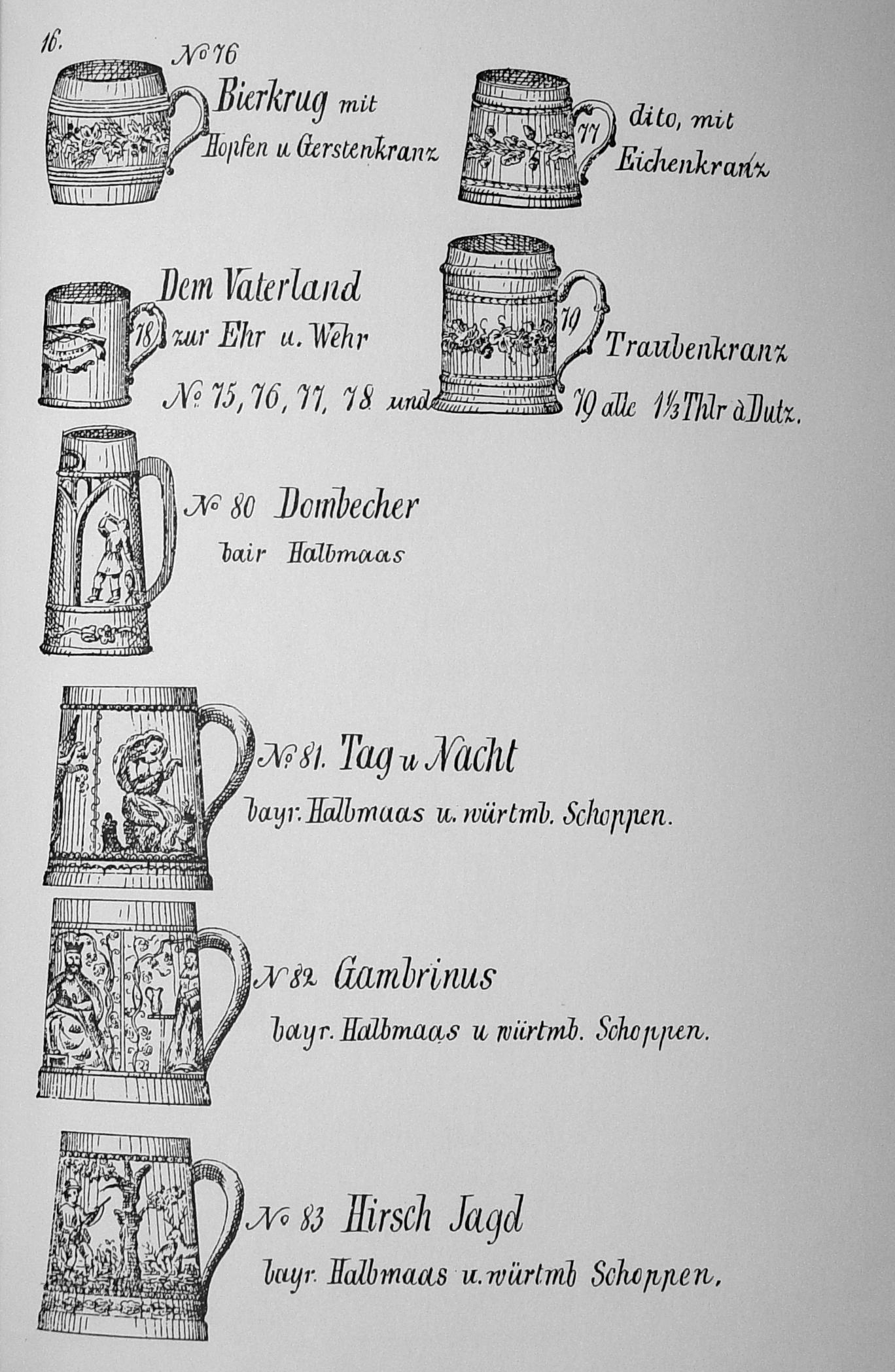 Who made this stein? Using available original manufacturers catalogs, this page allows you to look up possible answers to that question. Mold numbers beginning with 1 and ranging into the thousands appear in the first column below. For each mold number, the manufacturers who produced an item with that number are listed, along with a link to an original catalog page showing that item. Scroll down to the mold number in question, then examine the catalog pages to confirm the manufacturer of your stein.