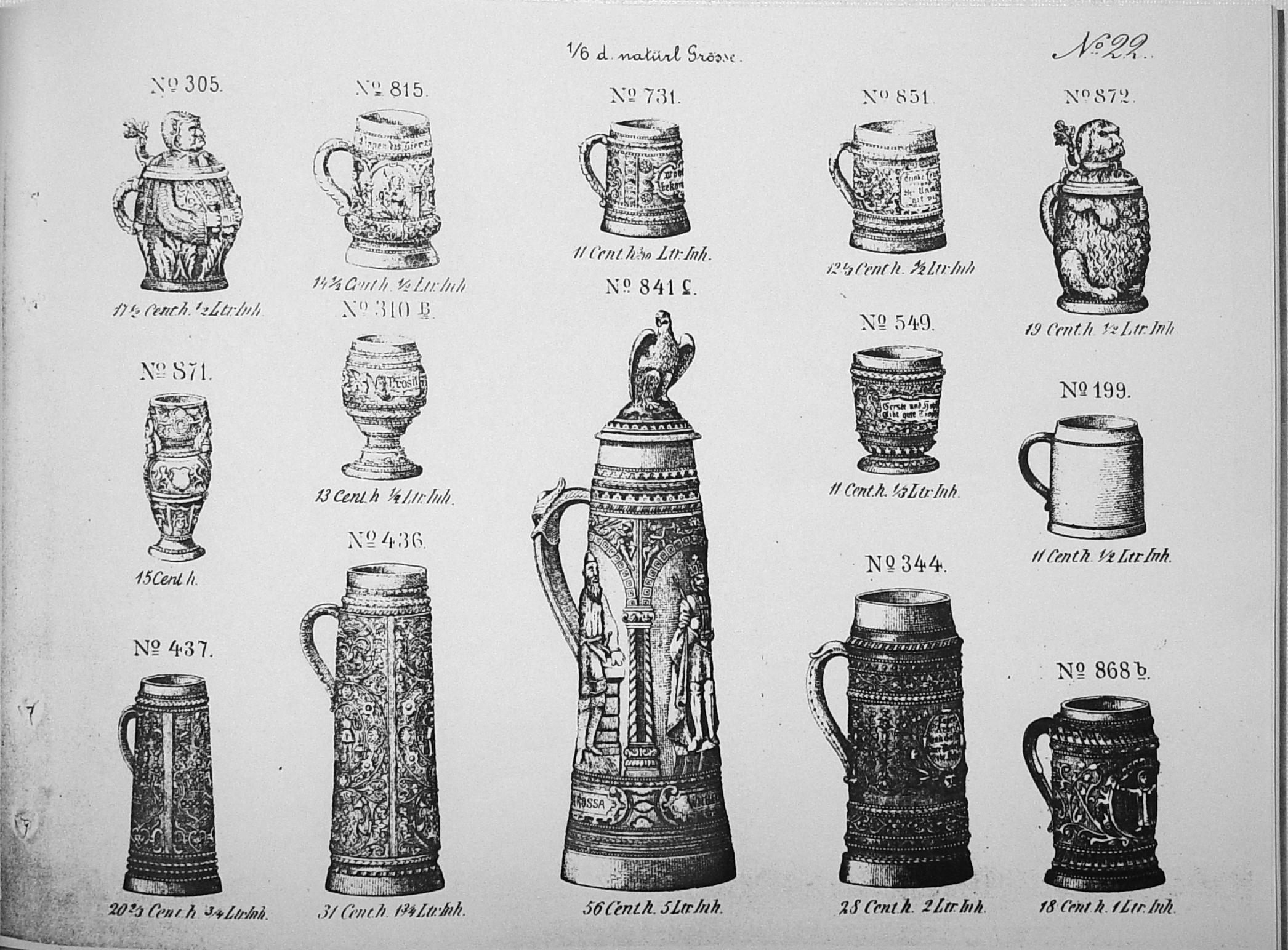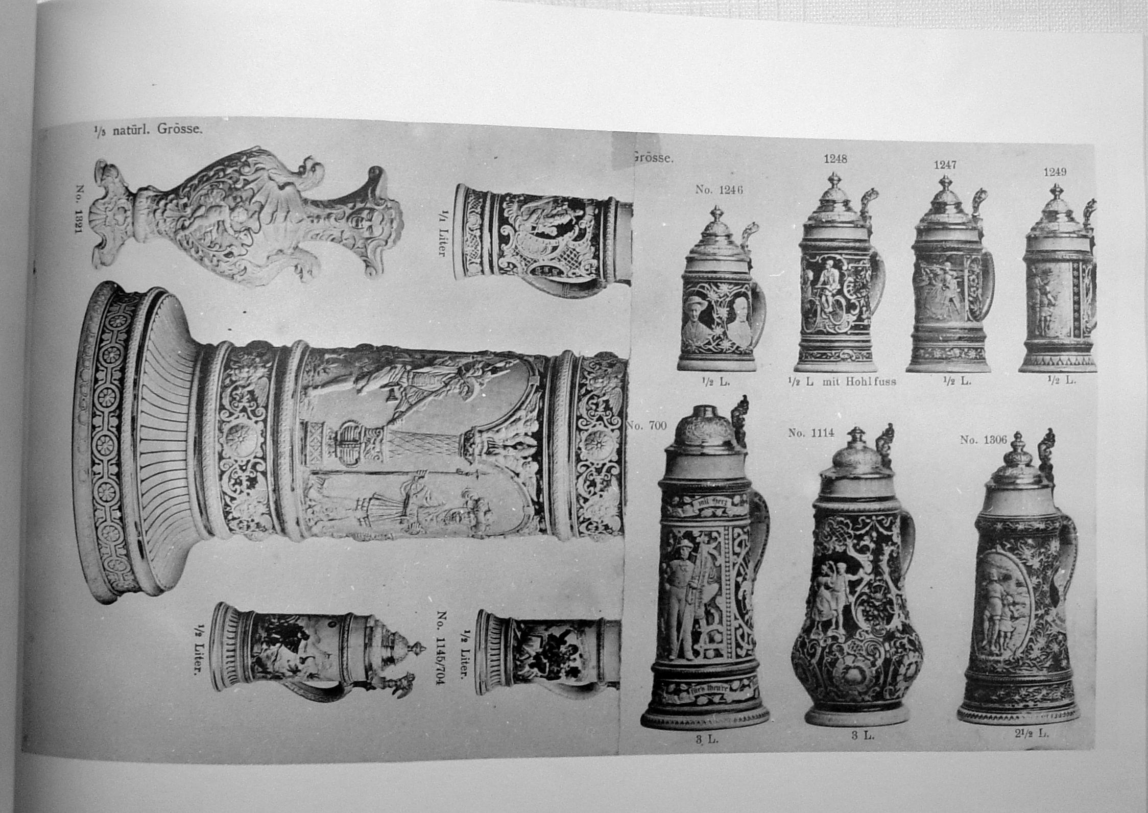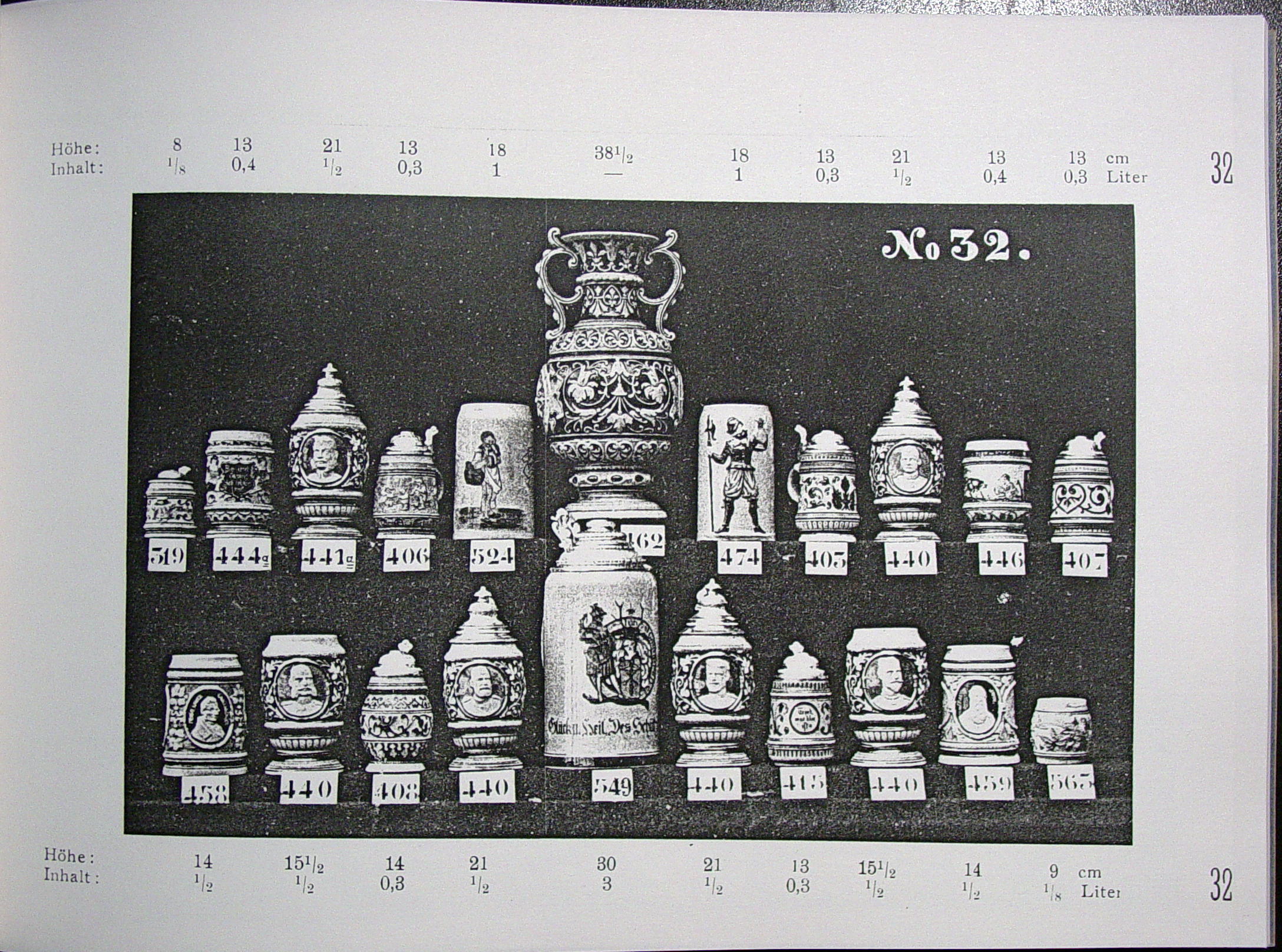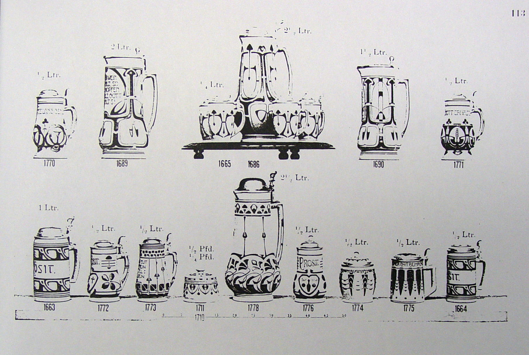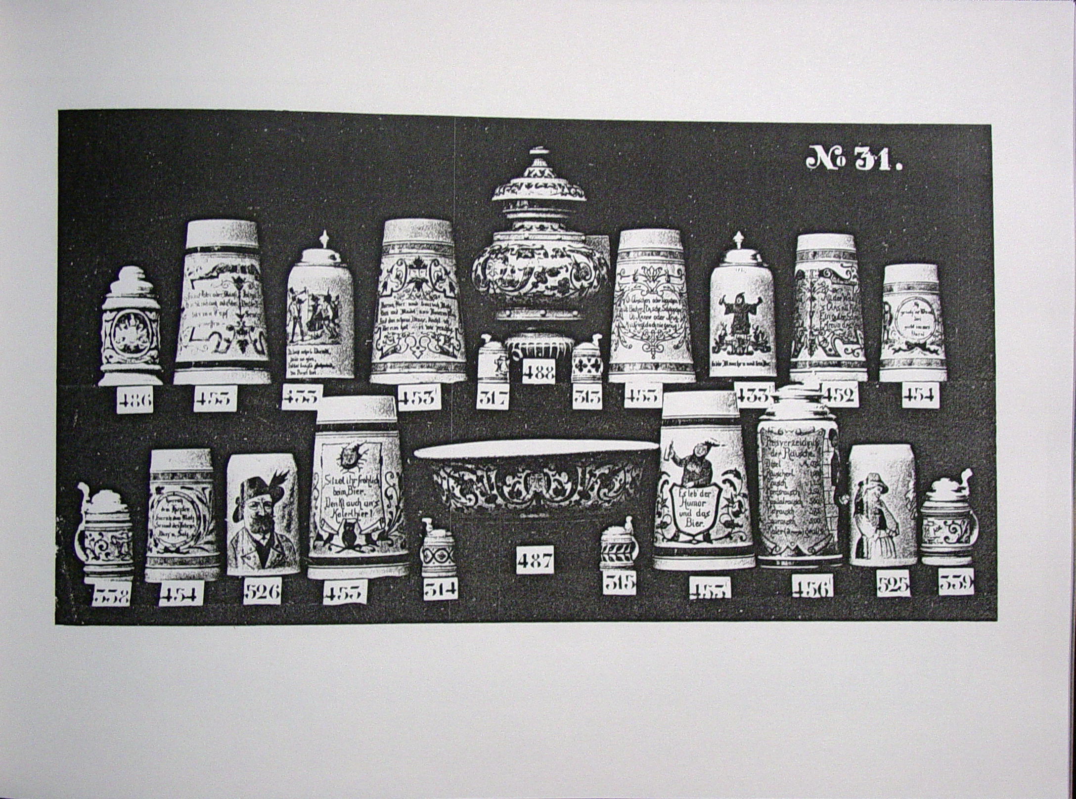 Who made this stein? Using available original manufacturers catalogs, this page allows you to look up possible answers to that question. Mold numbers beginning with 1 and ranging into the thousands appear in the first column below. For each mold number, the manufacturers who produced an item with that number are listed, along with a link to an original catalog page showing that item. Scroll down to the mold number in question, then examine the catalog pages to confirm the manufacturer of your stein.