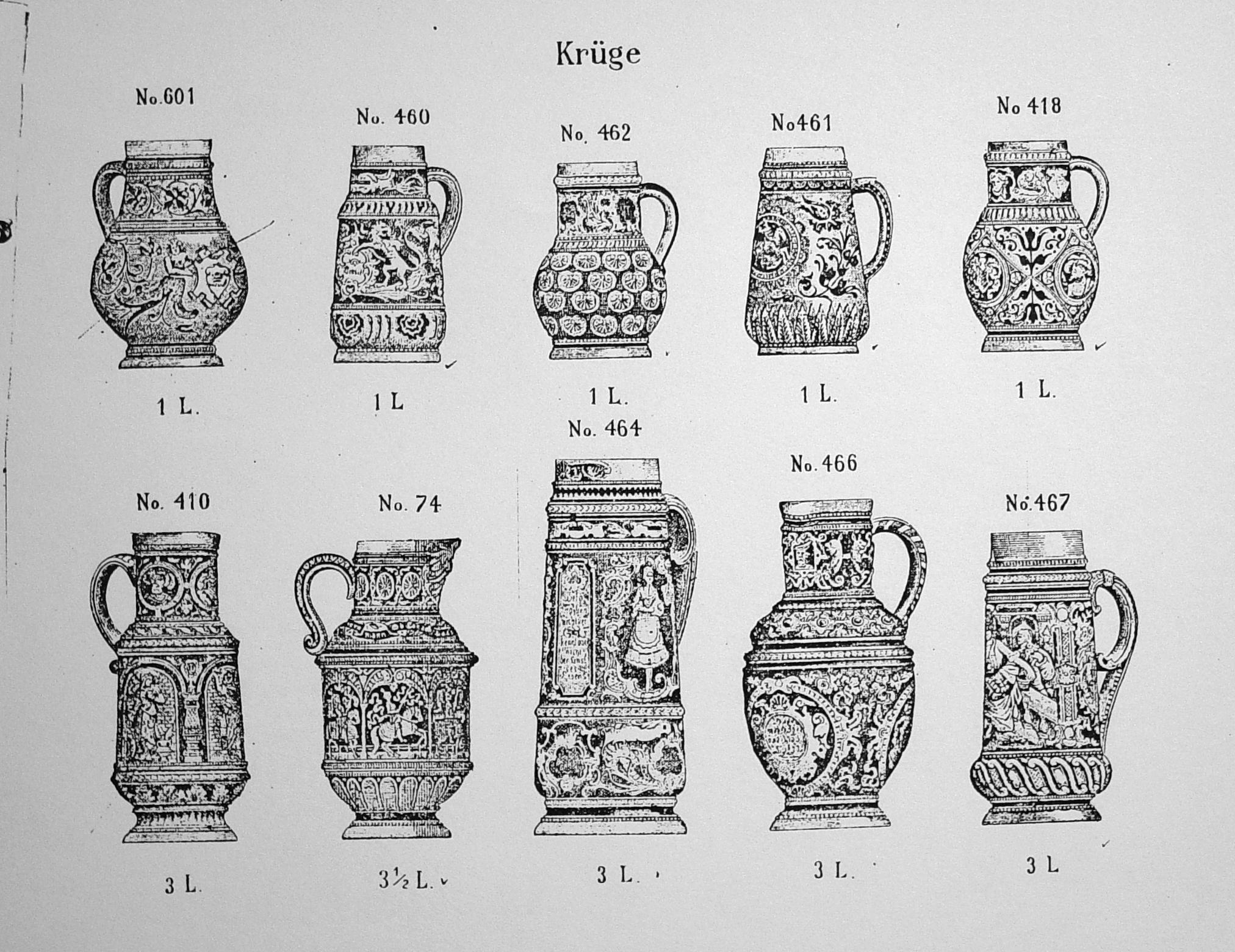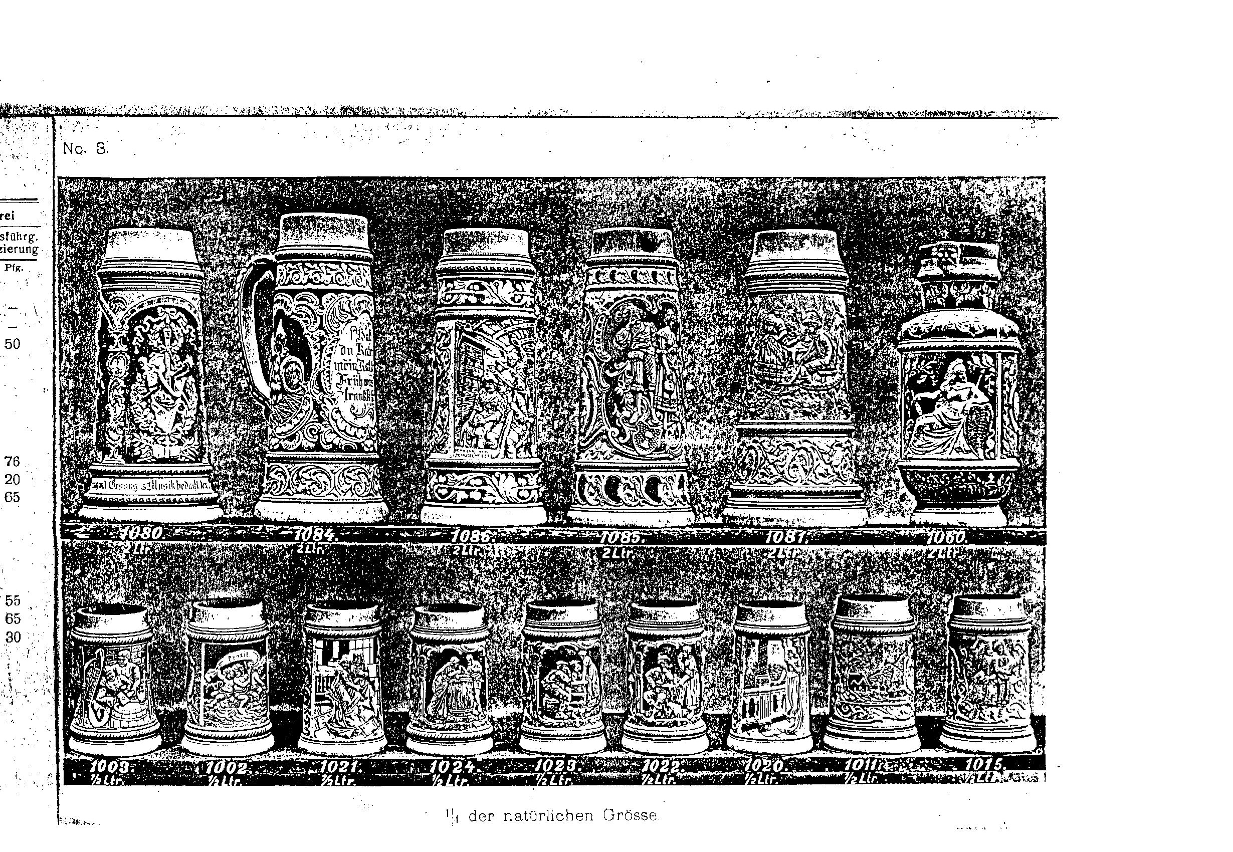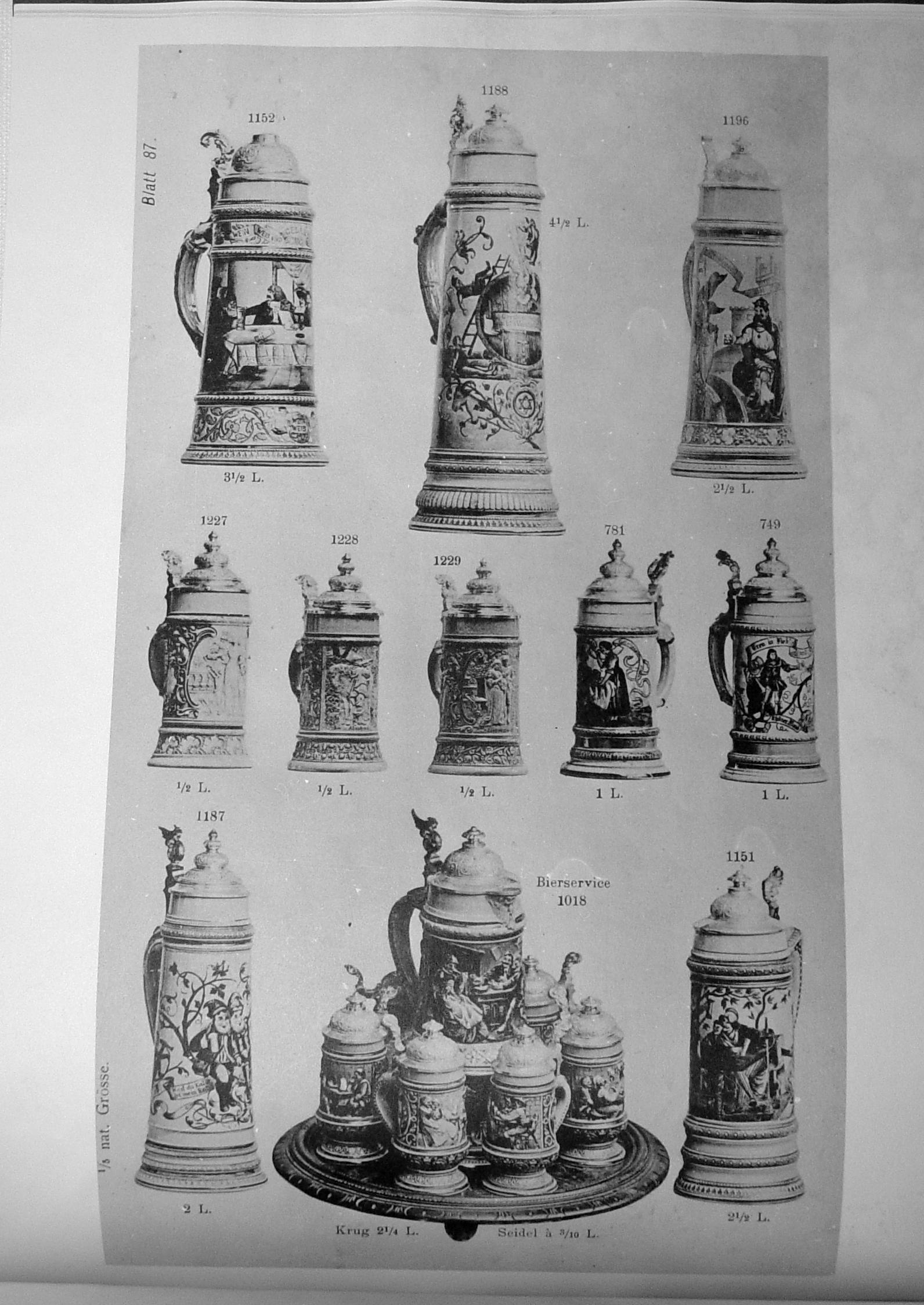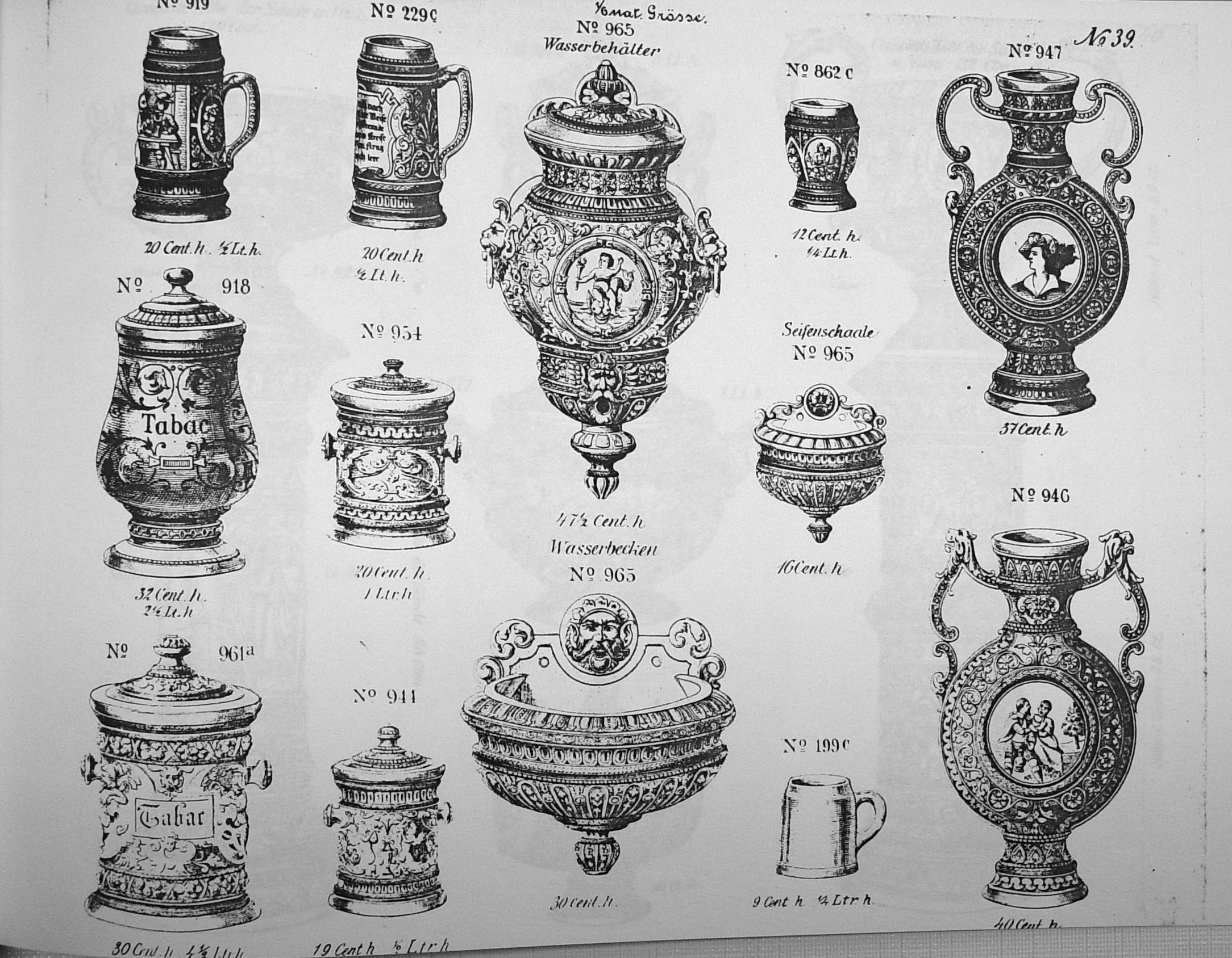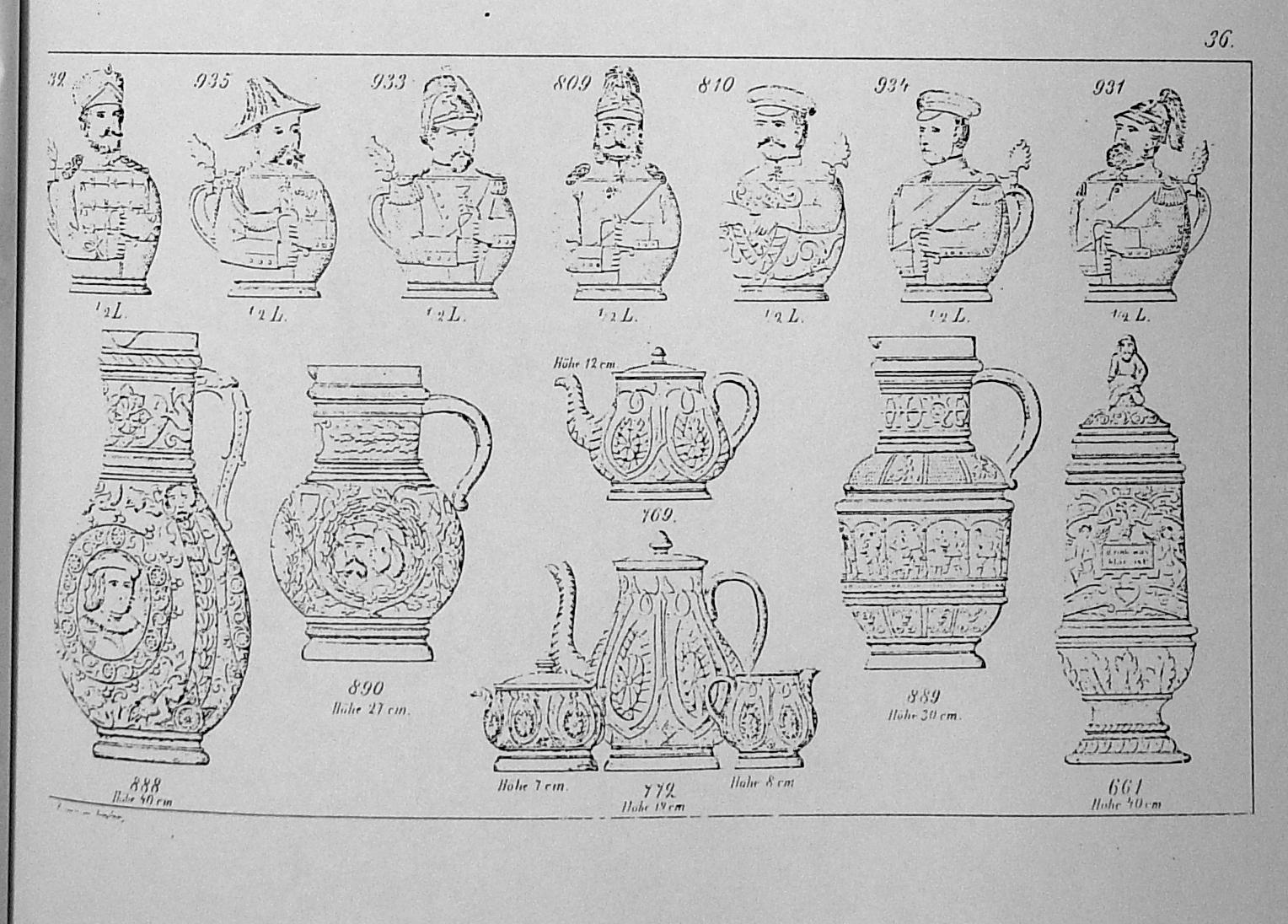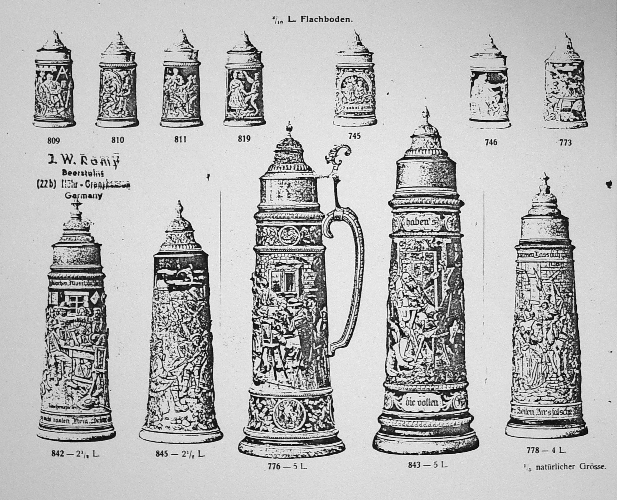 Who made this stein? Using available original manufacturers catalogs, this page allows you to look up possible answers to that question. Mold numbers beginning with 1 and ranging into the thousands appear in the first column below. For each mold number, the manufacturers who produced an item with that number are listed, along with a link to an original catalog page showing that item. Scroll down to the mold number in question, then examine the catalog pages to confirm the manufacturer of your stein.